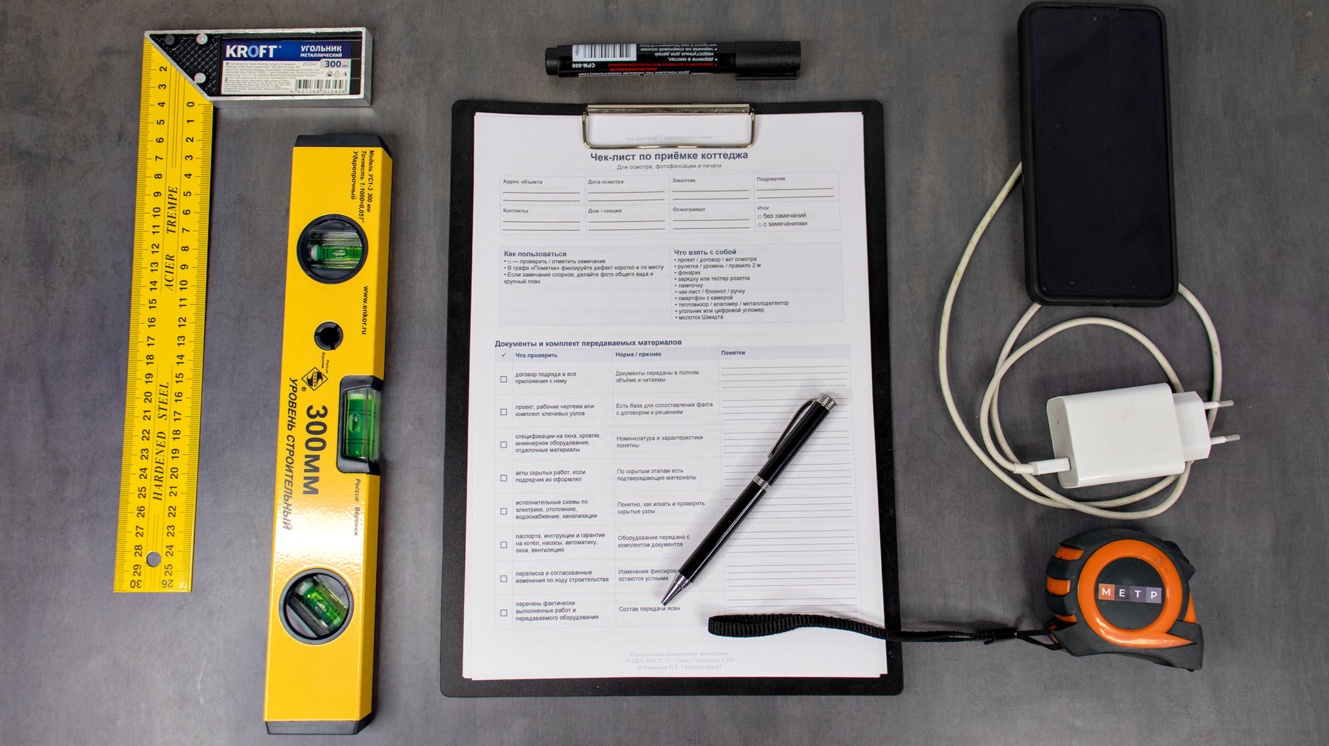 Чек-лист, рулетка, уровень, угольник, телефон и зарядка для приёмки дома