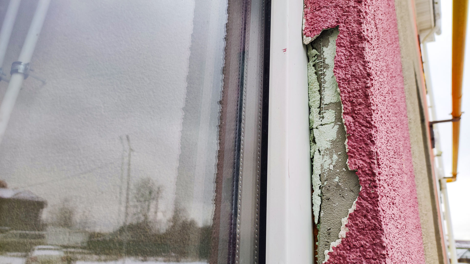Разрушение штукатурки и оголённый участок у оконной рамы могут указывать на ошибки в узле примыкания, через которые появляются продувание, намокание и промерзание.