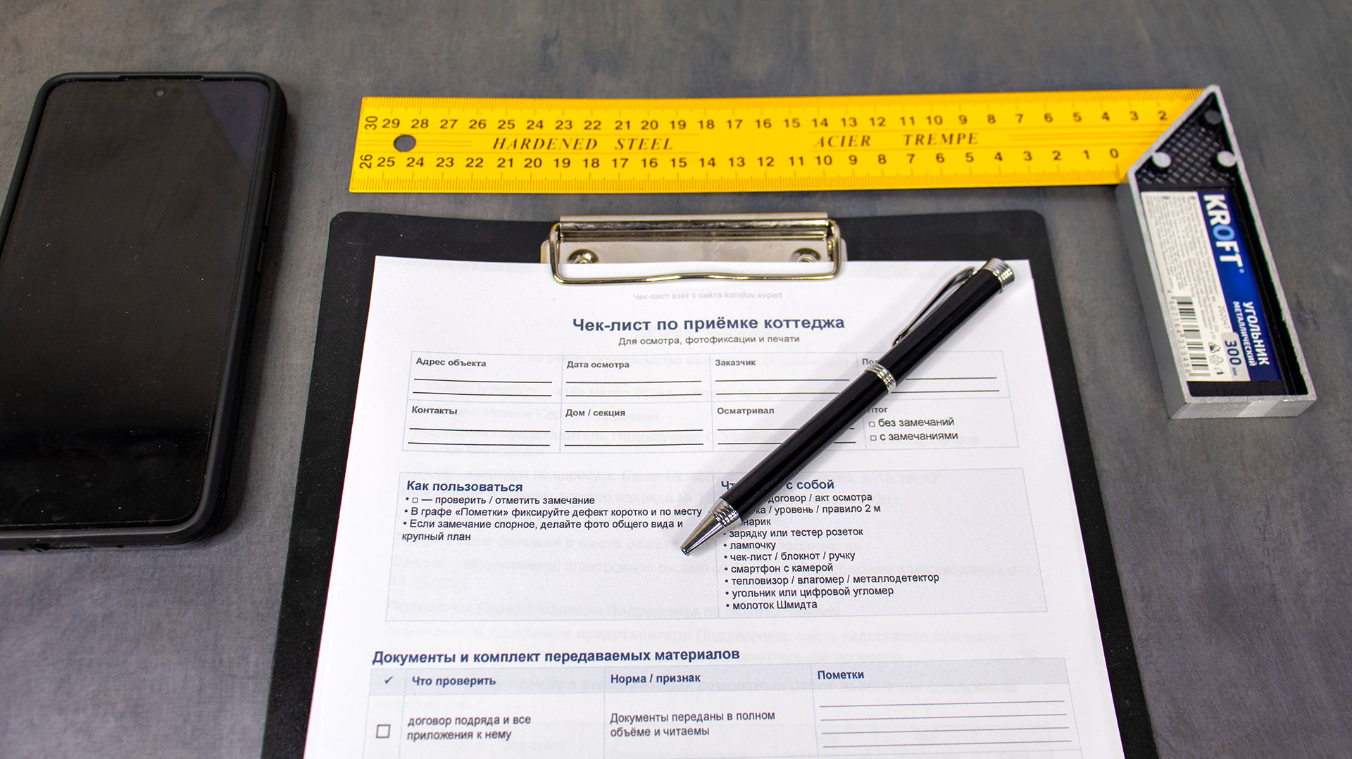 Чек-лист помогает пройти осмотр по пунктам, ничего не упустить и сразу фиксировать замечания при приёмке частного дома.