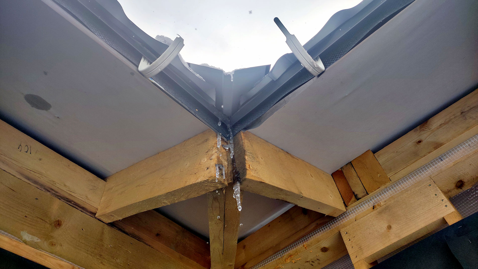Наледь в узле кровли и следы неправильного водоотвода при приёмке дома