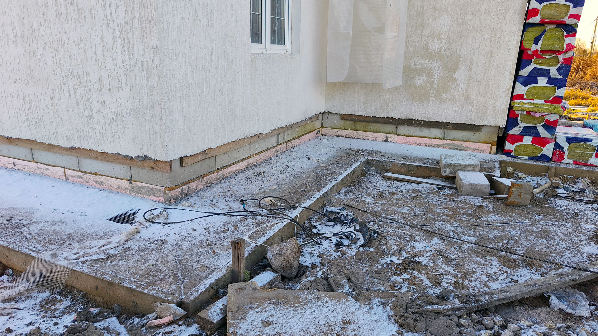Общий вид дома с недоделанным цоколем, примыканиями и незавершённой отмосткой при осмотре перед приёмкой