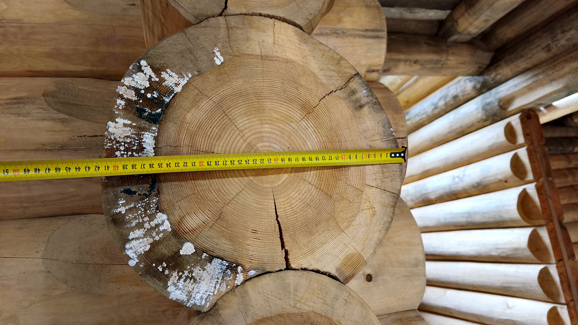 Фиксация намокания и плесени на торце бревна с измерением рулеткой