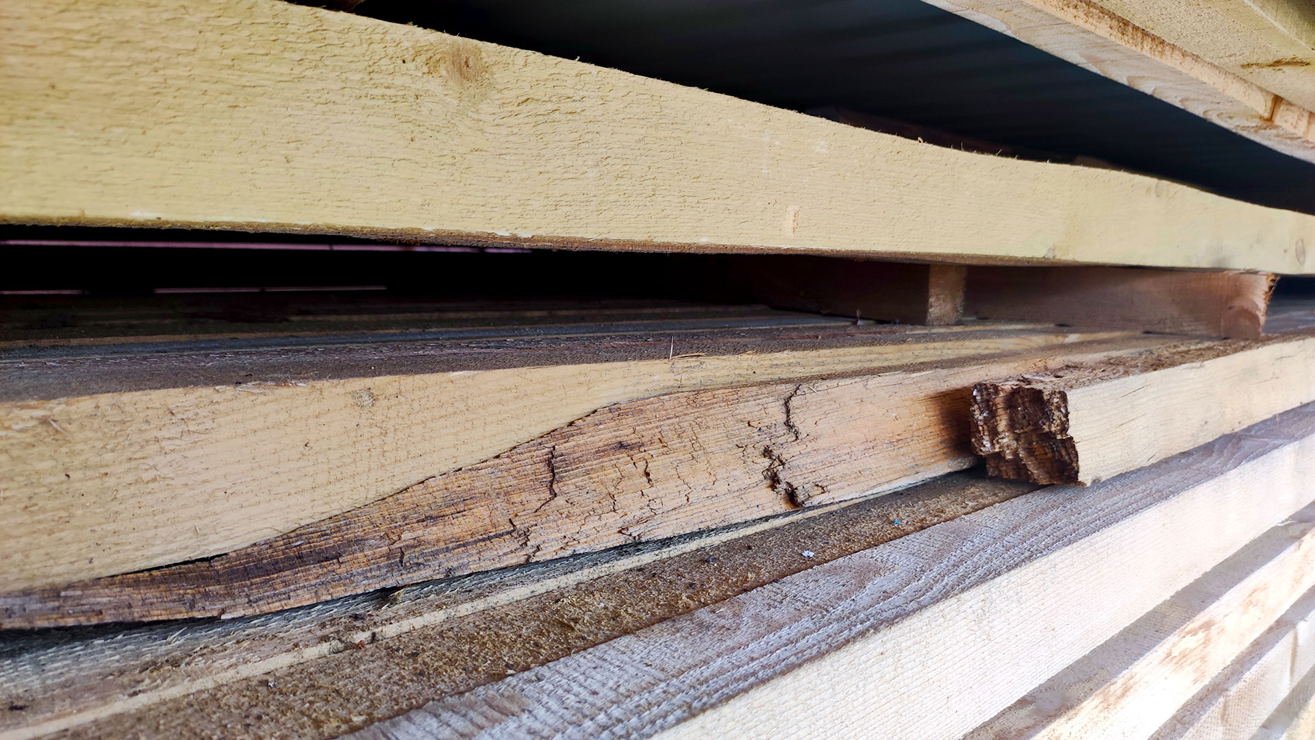 Доска в штабеле с трещинами и разрушением после намокания, подлежащая замене