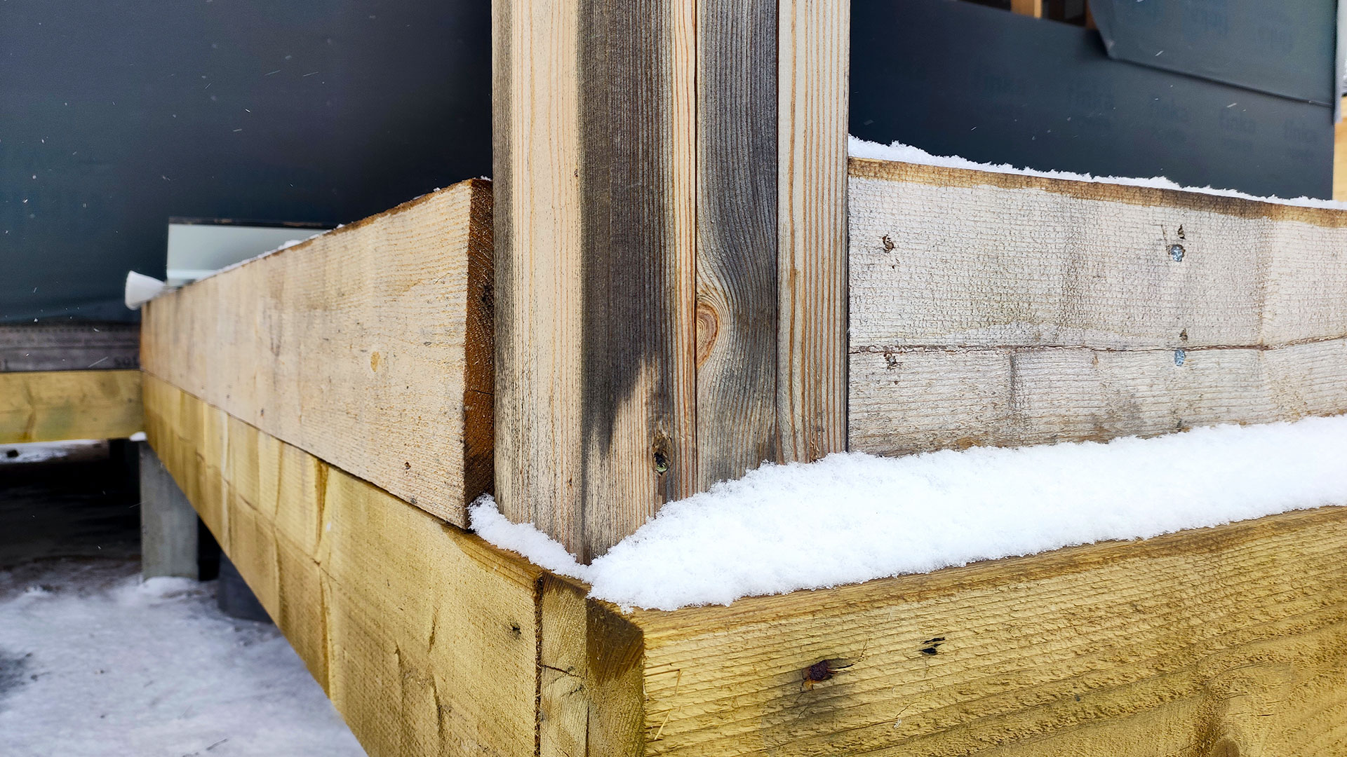 Во время сборки каркаса проблему часто создаёт сама последовательность работ. Часть конструкции уже собрали, но временная защита не работает, примыкания не закрыты, проёмы остаются открытыми, кровля ещё не даёт нормальной отсечки воды. В результате пиломатериал намокает уже не на складе, а прямо в собранном узле.