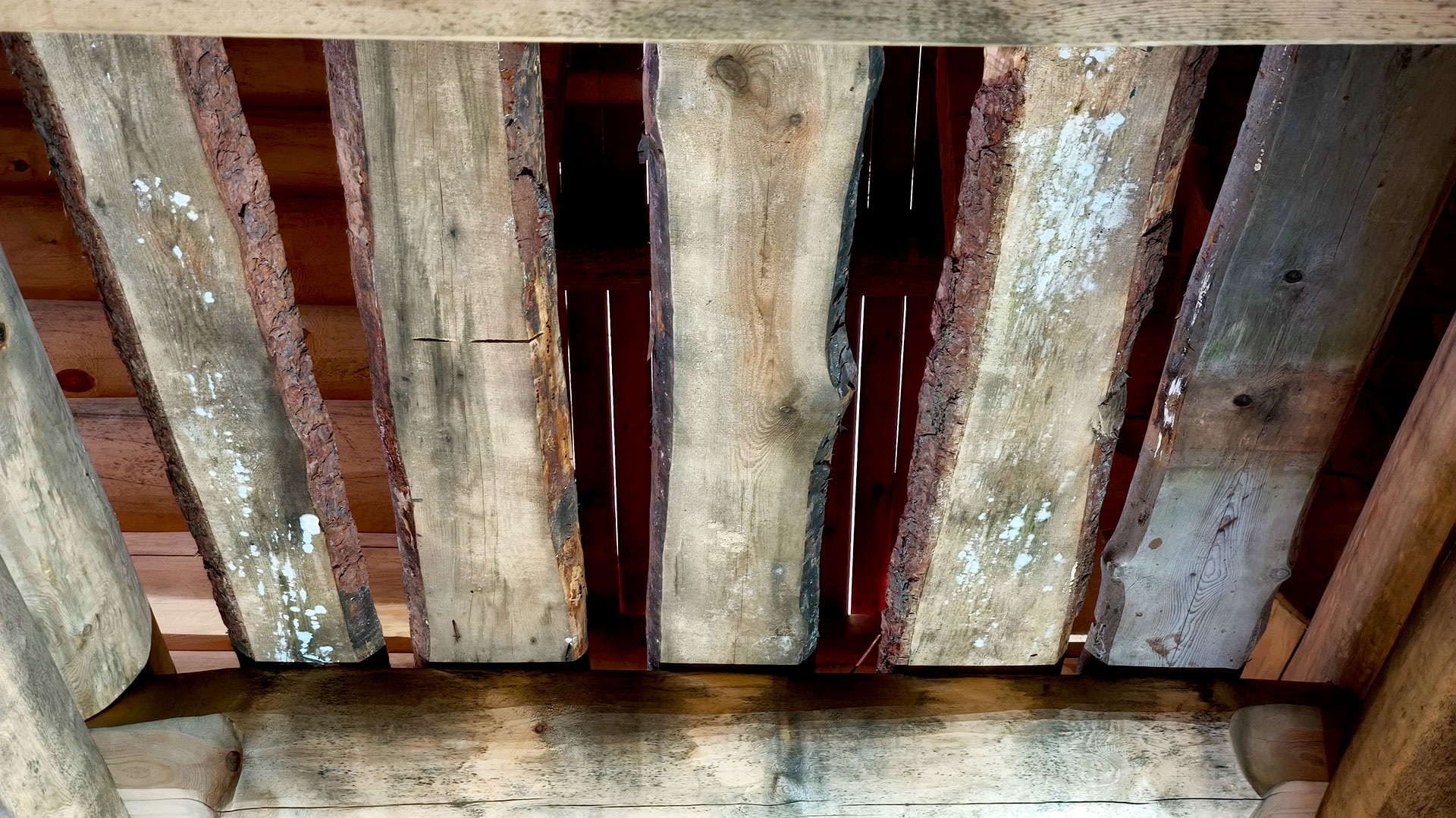 Следы намокания и биопоражения на деревянных элементах перекрытия