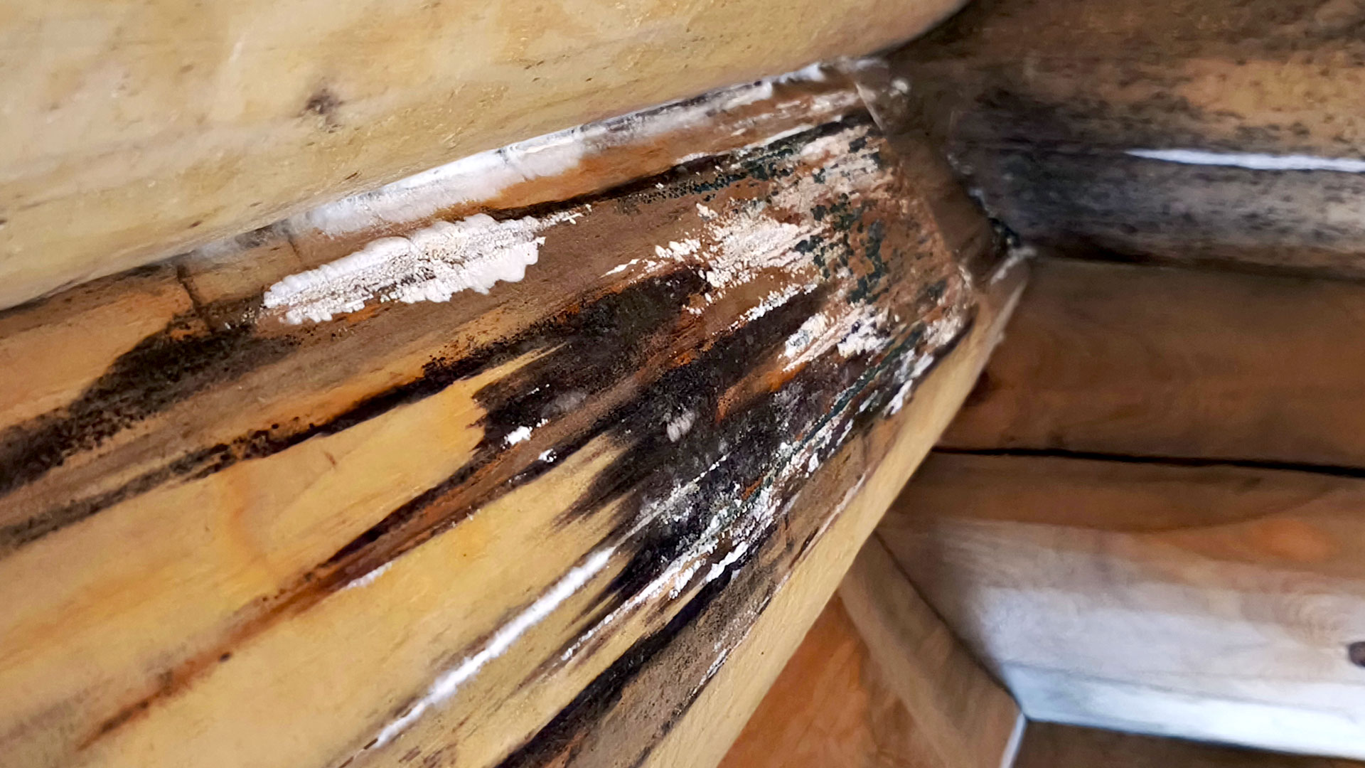 Плесень, тёмные грибные окраски и следы биопоражения на поверхности древесины