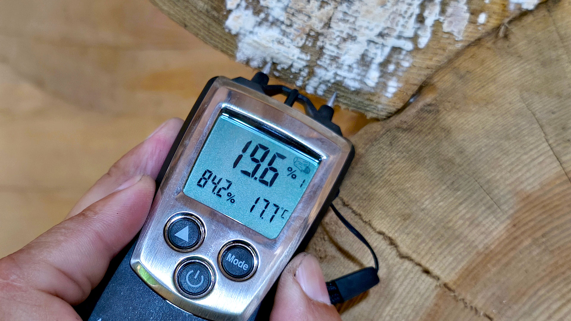 Измерение влажности древесины в зоне с потемнением и белым налётом