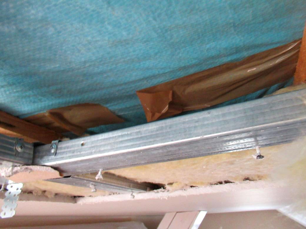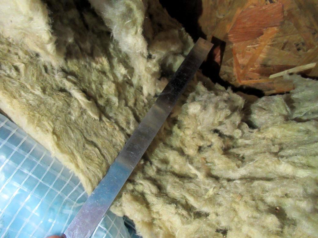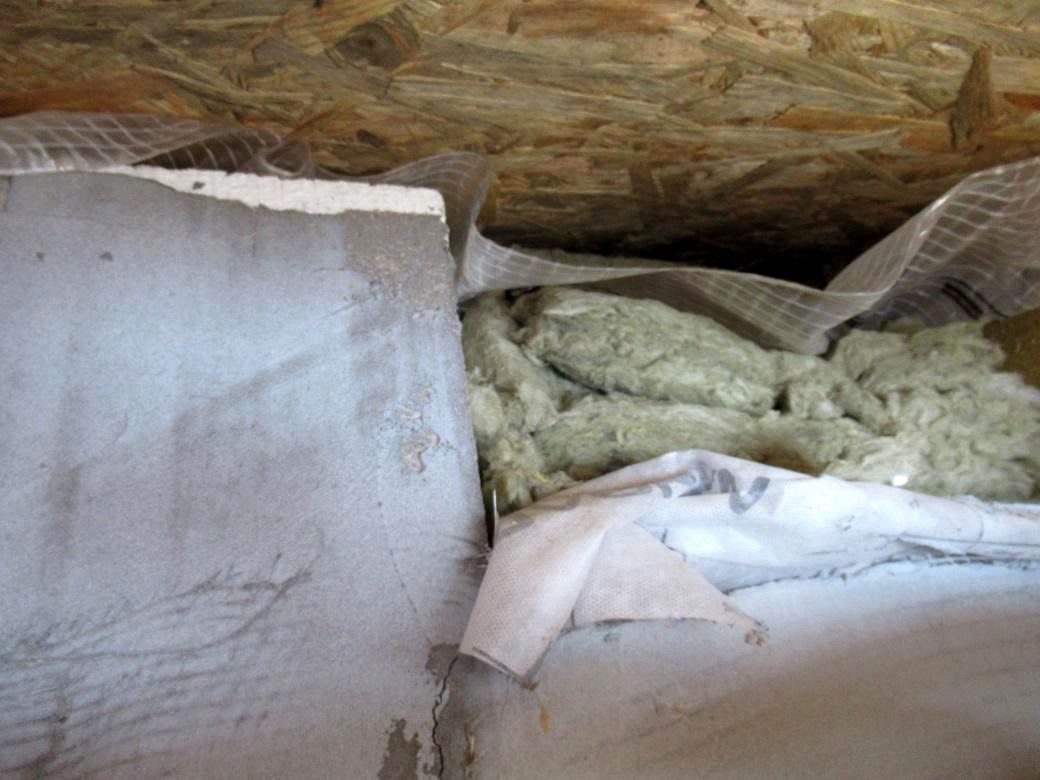При обследовании было установлено, что пароизоляция утеплителя из минеральной ваты толщиной 60 мм со стороны помещения не выполнена. Для такой конструкции это означает, что водяной пар из внутреннего воздуха мог попадать в утеплитель и дальше в толщу кровельного пирога.
