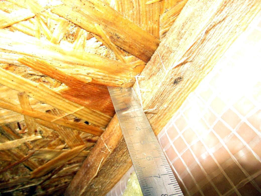 На участке вскрытия было установлено, что вентиляционный зазор между утеплителем и ориентированно-стружечной плитой составляет 25 мм. Для такой конструкции этого недостаточно. Пункт 4.5 СП 17.13330.2017 «Кровли» требует, чтобы высота вентиляционного канала между поверхностью теплоизоляции и основанием под кровлю была не менее 50 мм.