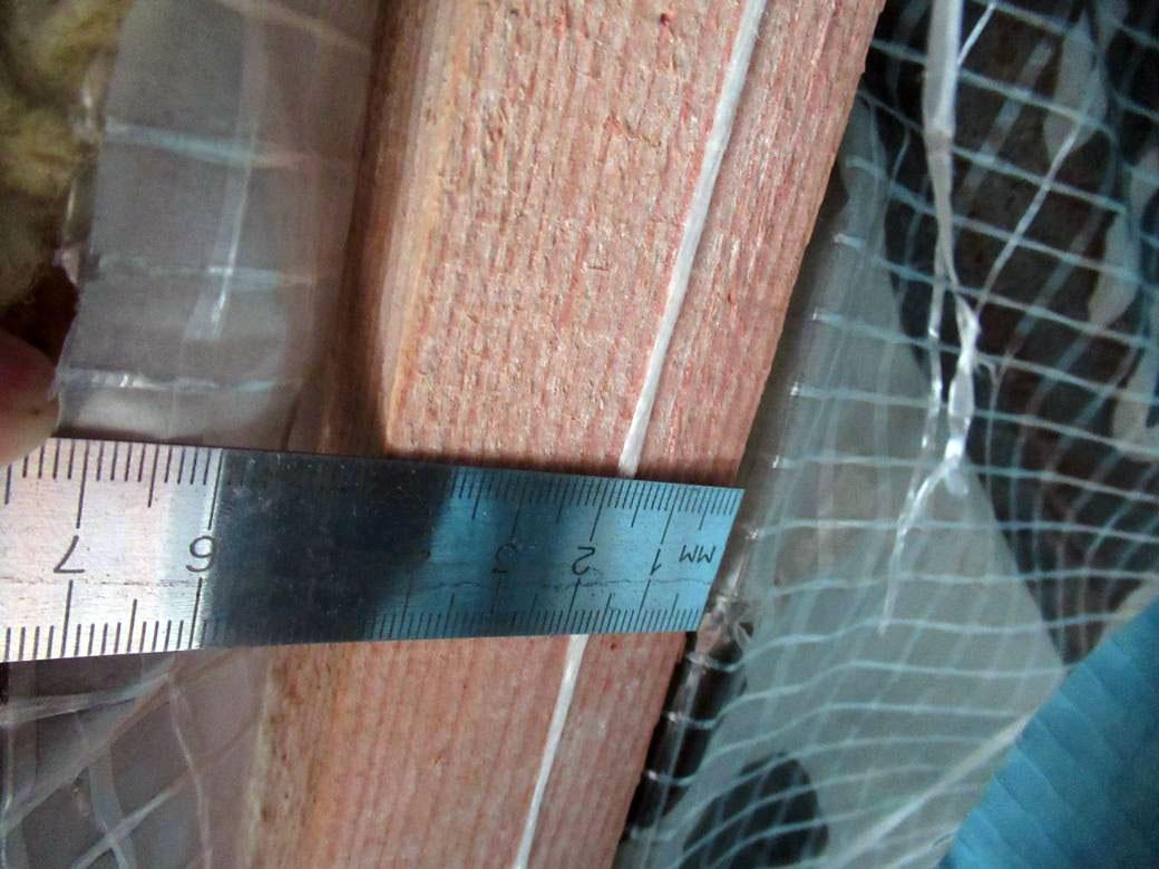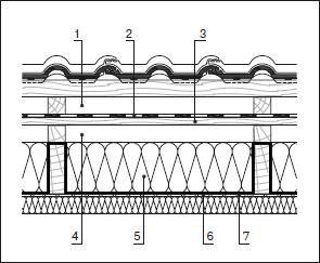 пароизоляцию из полипропиленовой плёнки, уложенную между внутренней контробрешёткой из доски толщиной 25 мм и стропилами сечением 50×200 мм;