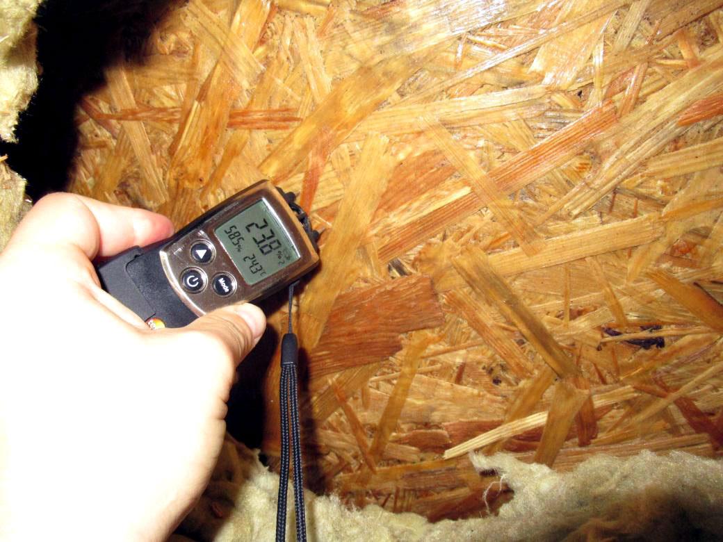 Именно это было зафиксировано и при вскрытии кровельного пирога. Повышенная влажность ОСП подтвердилась не только визуально, но и измерениями. На момент обследования влажность ориентированно-стружечной плиты составляла 21,6% и 23,8%.