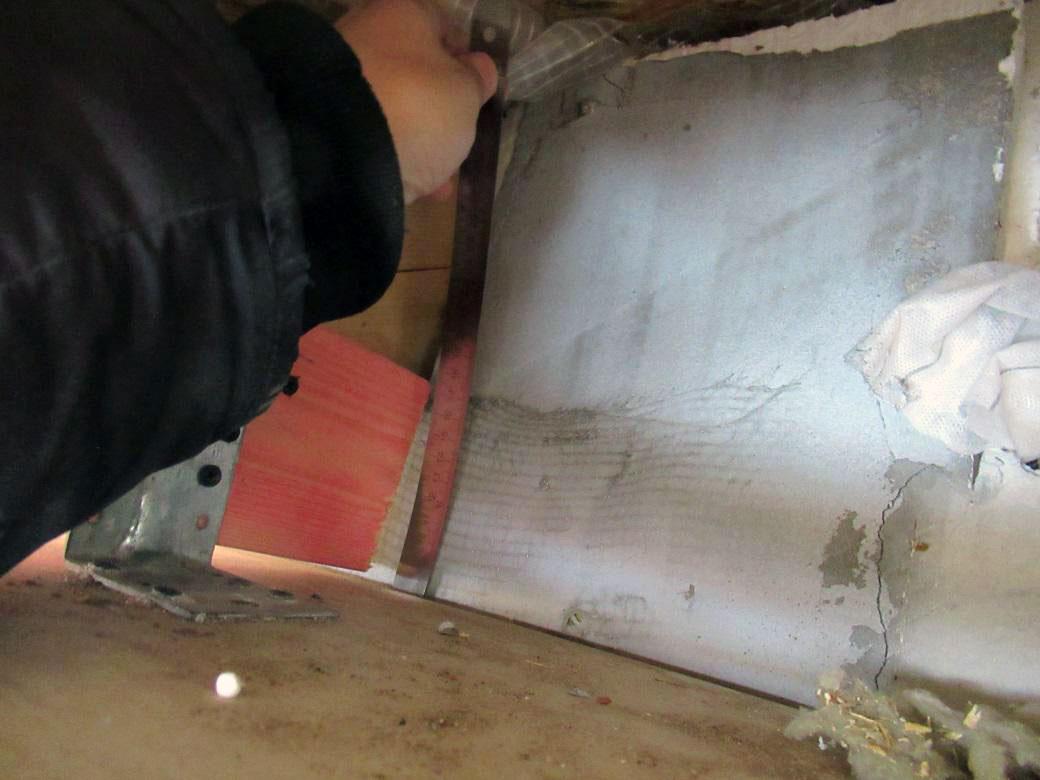 Основная часть работы проходила в двух зонах. Первая находилась на мансардном этаже исследуемого ската. Здесь со стороны внутренней отделки было выполнено контрольное вскрытие, чтобы определить фактический состав кровельного пирога, измерить толщину слоёв и проверить устройство утепления, вентиляционного зазора и пароизоляции. Вскрытие выполняли представители заказчика в моём присутствии.
