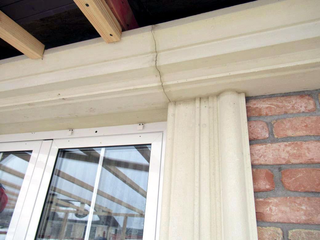 Именно так в этом узле нарушения в конструкции кровли могли проявляться уже снаружи дома: сначала влага накапливалась и перенаправлялась в сторону стены, а затем это приводило к намоканию фасада, деформации лепнины и раскрытию монтажных швов между декоративными элементами.