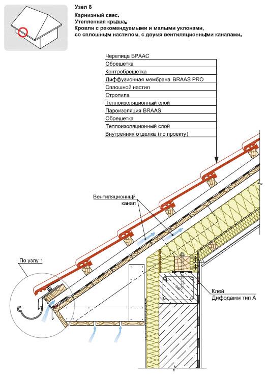 Такая же схема предусмотрена и технической документацией BMI BRAAS для утеплённых кровель со сплошным настилом и рекомендованными либо малыми уклонами. В альбоме технических решений производителя показаны и общий разрез такой кровли, и узел карнизного свеса с двумя вентиляционными каналами. То есть по исходным материалам и по типовым решениям производителя на этом доме должна была быть выполнена конструкция, в которой воздух свободно проходит через вентиляционные зазоры, а влага не запирается внутри кровельного пирога.