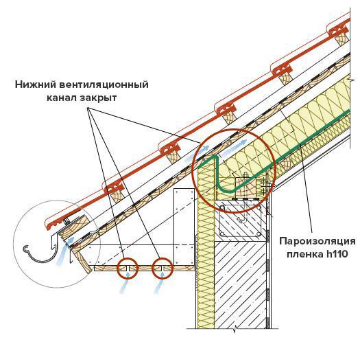 Ситуационно места перекрытия нижнего вентиляционного канала и предполагаемое расположение пароизоляции Н110 в узле примыкания кровли к стене показаны на схеме ниже.
