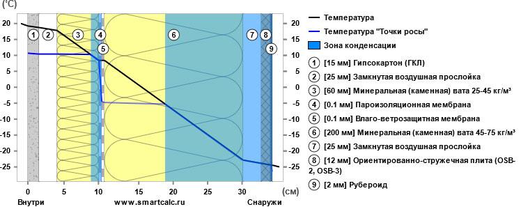 Чтобы оценить, как это влияет на влажностный режим конструкции, в заключении был выполнен второй предварительный теплотехнический расчёт. На этот раз расчёт проводился с допущением, что воздушная прослойка между теплоизоляцией и ОСП является замкнутой и не обеспечивает нормальную вентиляцию.