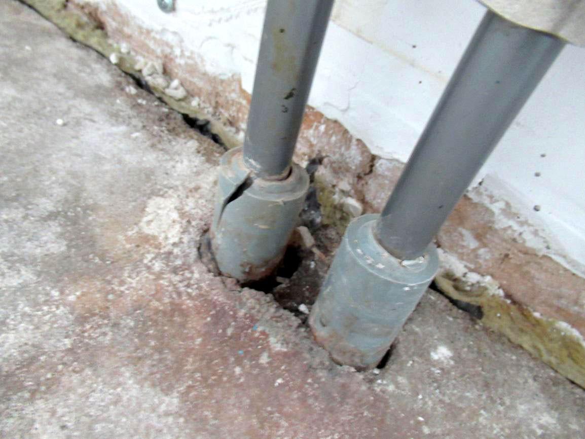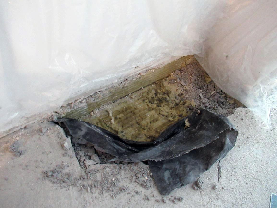 После вскрытия участка пола было установлено, что утеплитель под демонтированным слоем стяжки насыщен влагой.