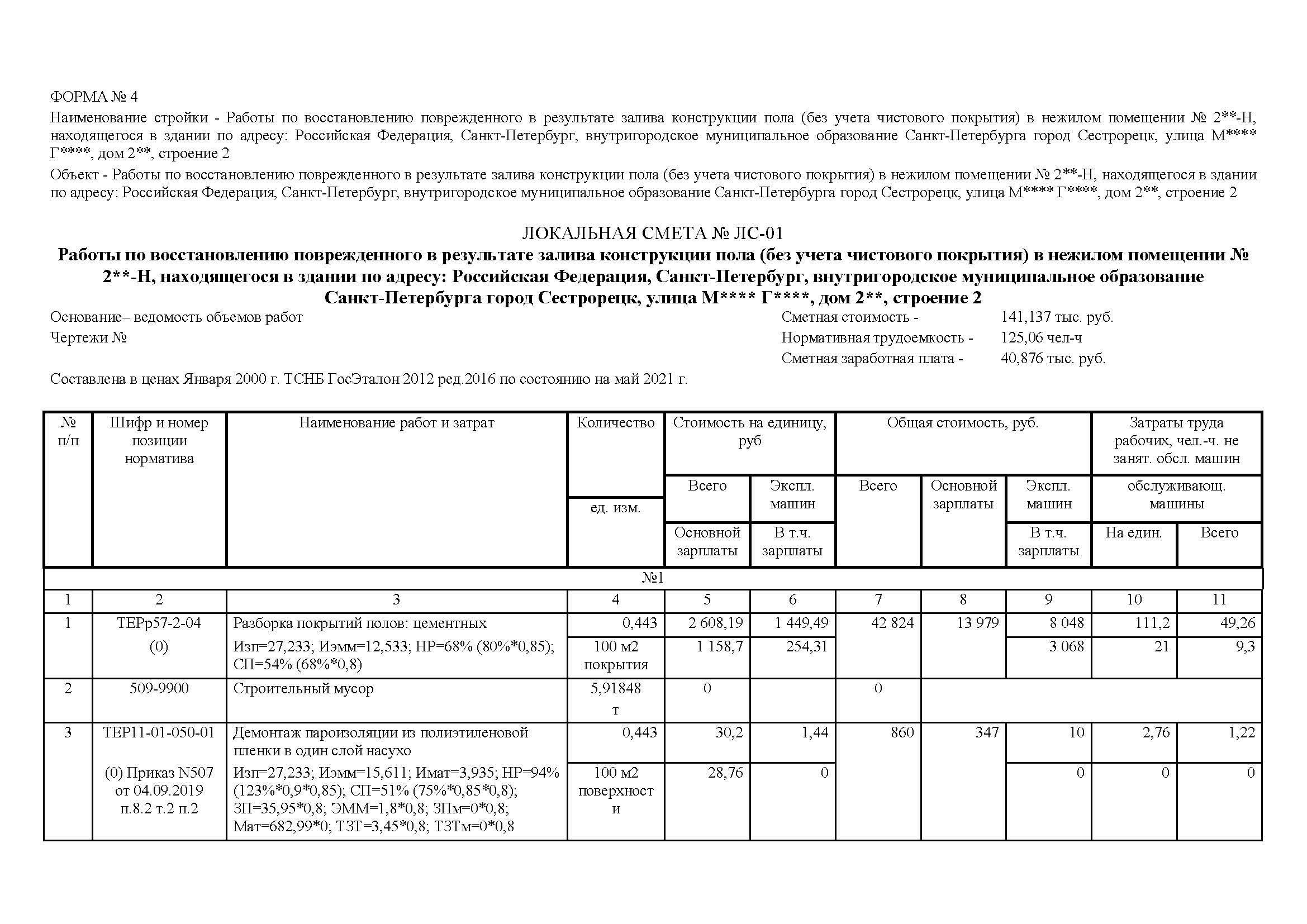 По итогам расчета стоимость восстановления поврежденной в результате залива конструкции пола без учета чистового покрытия составила 141 137 рублей.