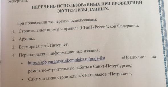 Один из первых слабых моментов этого заключения связан с тем, как эксперт вообще показал свою методику. В перечне использованных данных он указал очень размытые источники: СНиП, архивы, интернет, прайс-листы на строительные работы и сайт магазина строительных материалов. Но дальше по тексту не объяснил, что именно он из этого использовал.