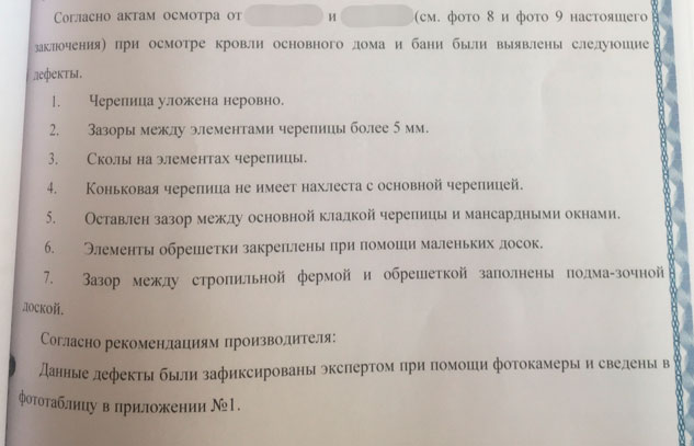 Одна из главных проблем этого заключения связана с тем, как эксперт вообще подошел к теме дефектов. По результатам осмотров он перечислил несколько недостатков кровли, а потом использовал их дальше, когда отвечал на вопросы о стоимости выполненных работ и стоимости устранения дефектов. Но сам по себе такой список еще не доказывает наличие дефектов.