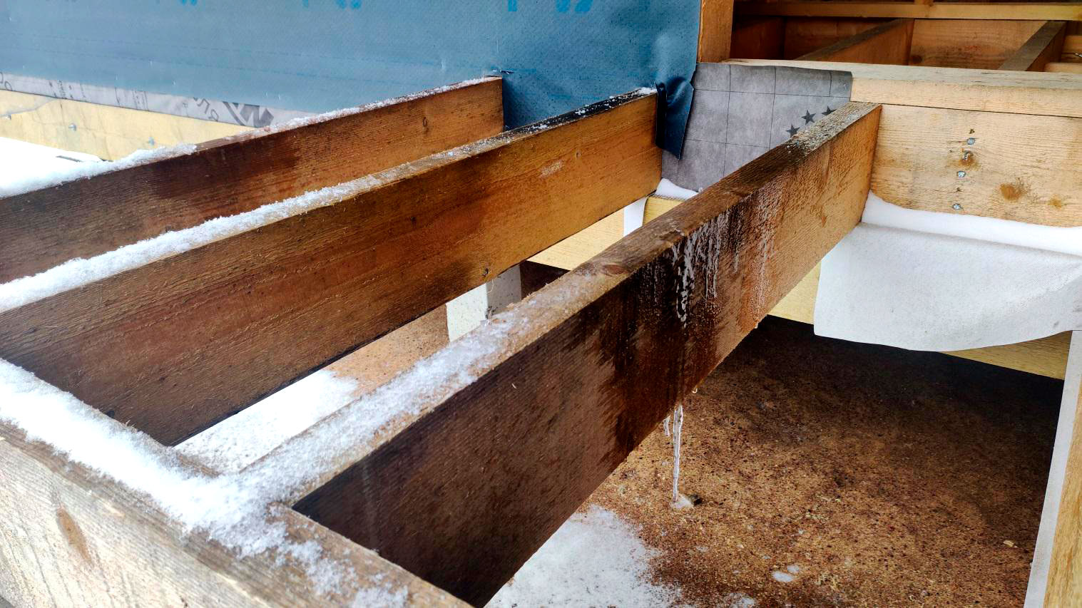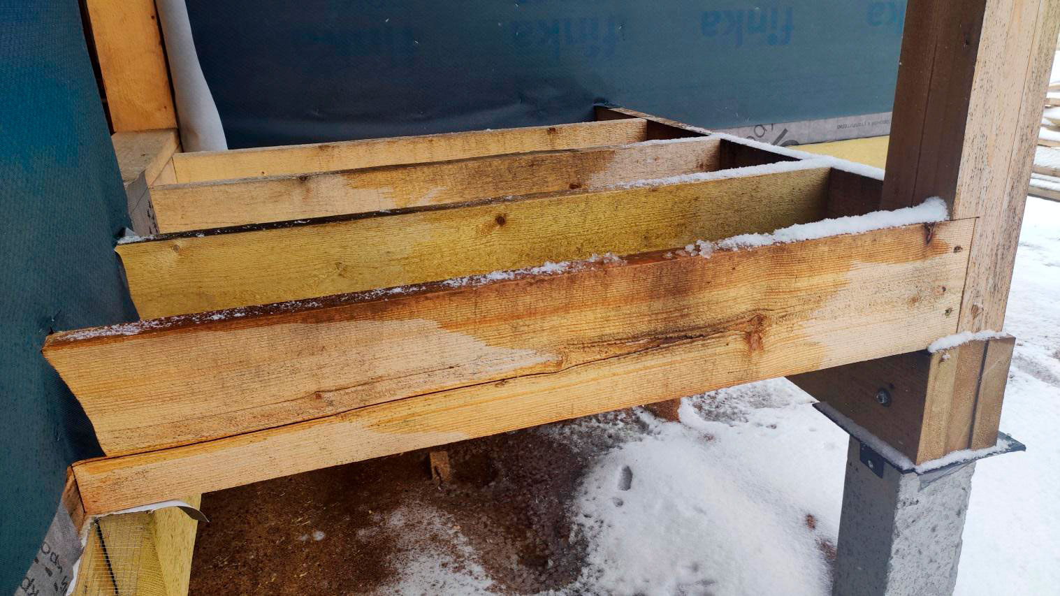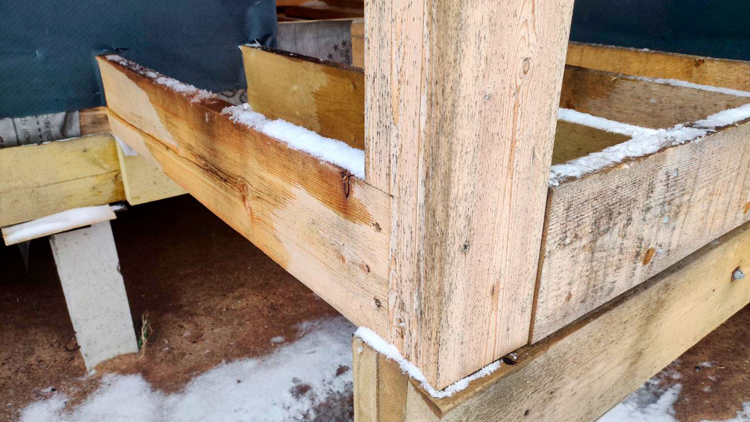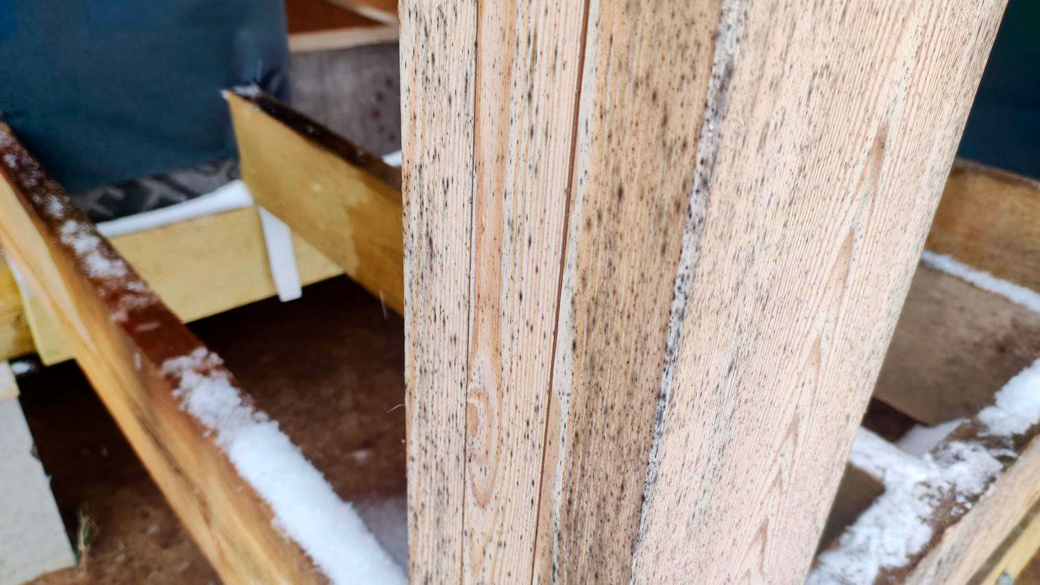 Внутри каркаса лежит снег на материалах и деревянных элементах, которые ещё не обработаны антисептированными/биозащитными составами. Это прямой признак того, что внутреннее пространство не защищено и конструкция регулярно получает влагу.