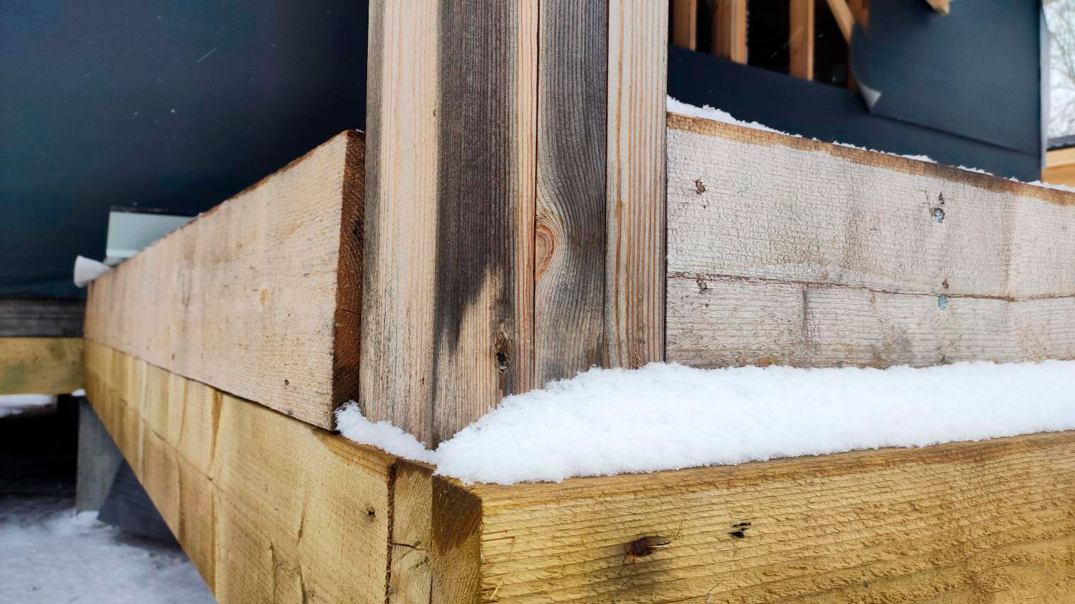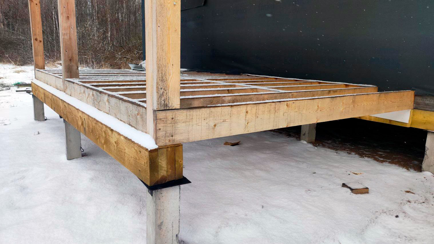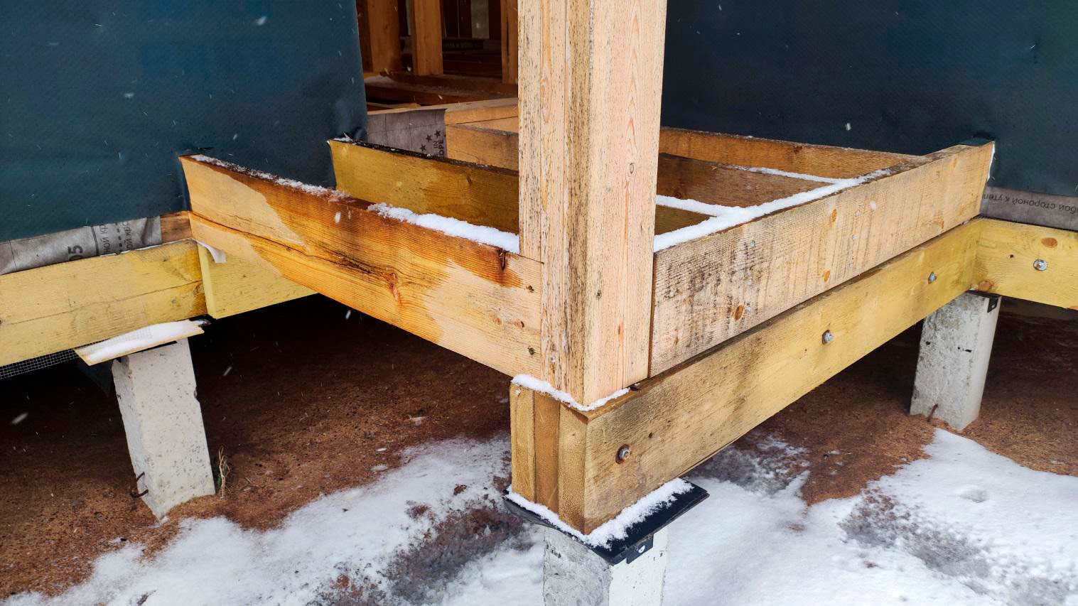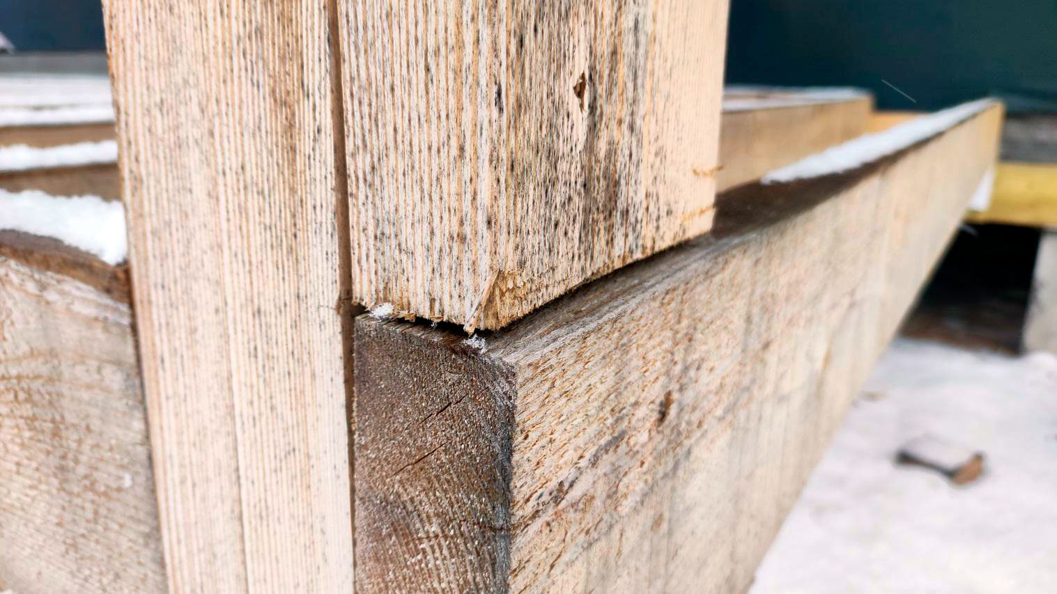 Внутри каркаса лежит снег на материалах и деревянных элементах, которые ещё не обработаны антисептированными/биозащитными составами. Это прямой признак того, что внутреннее пространство не защищено и конструкция регулярно получает влагу.