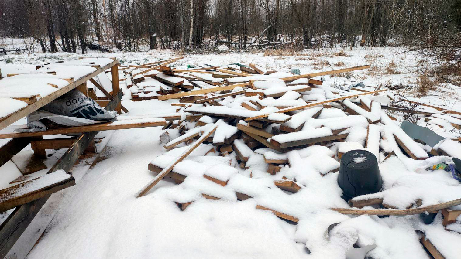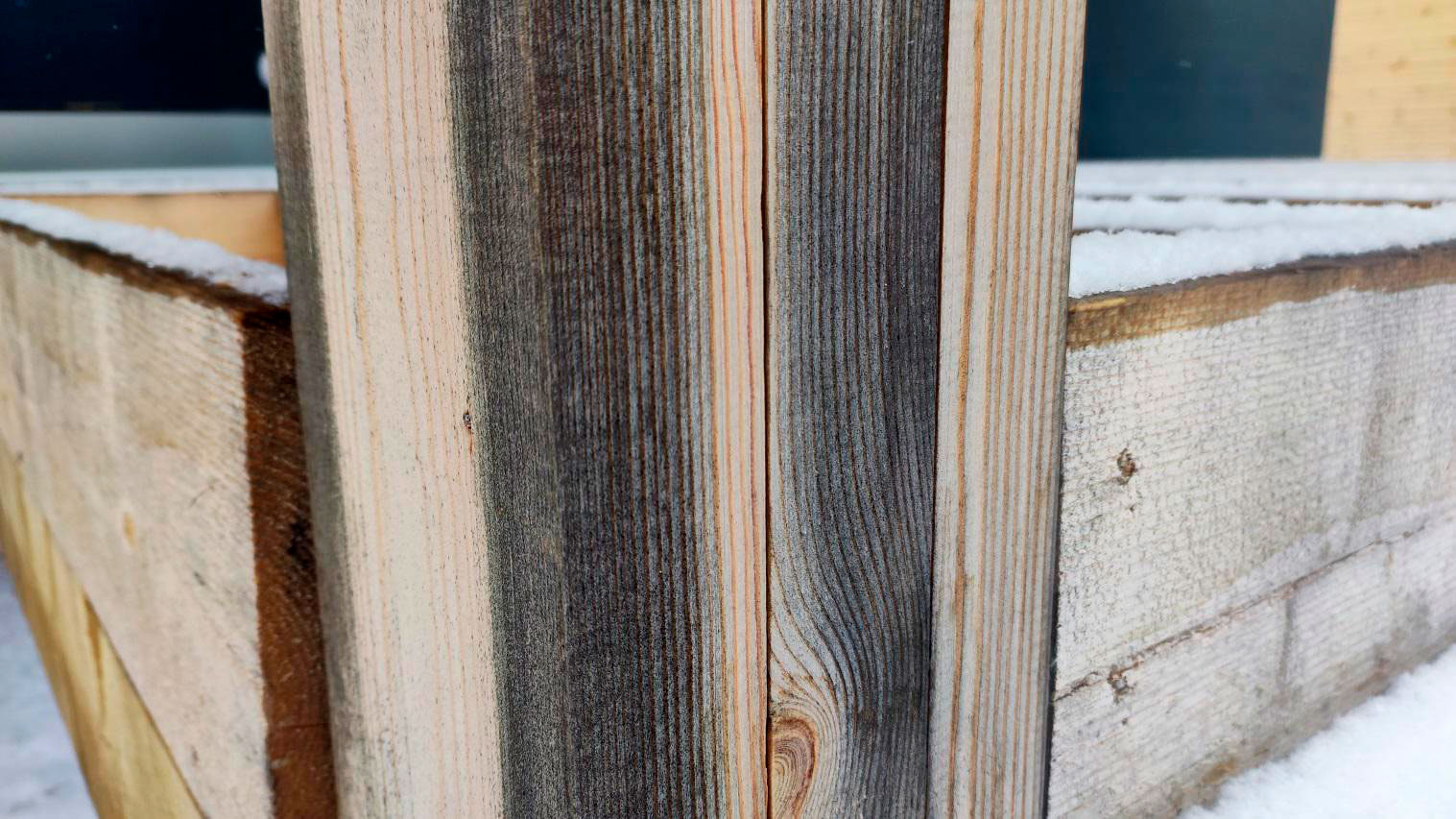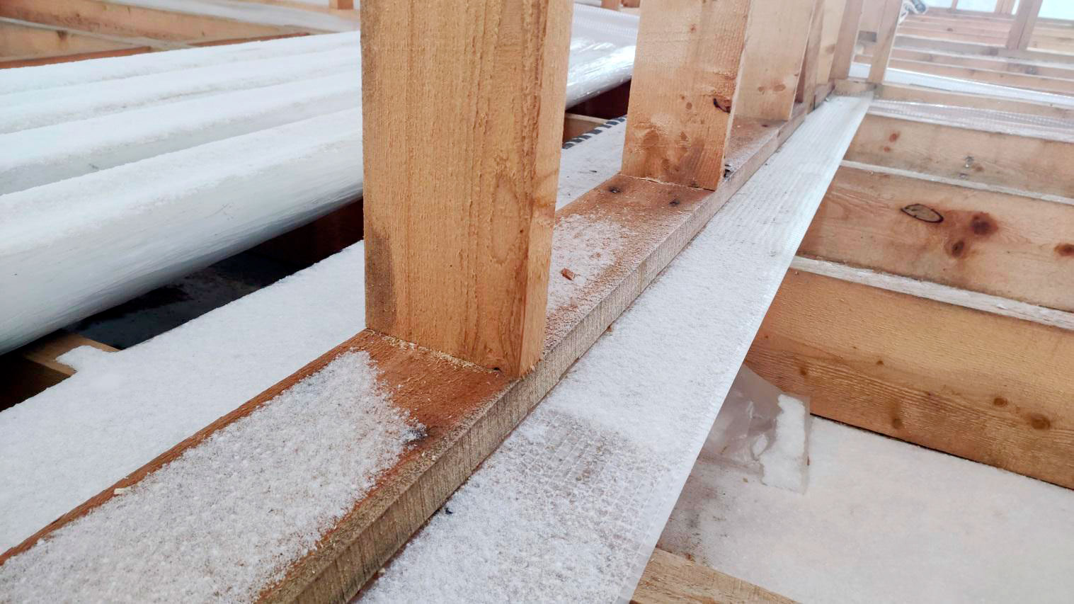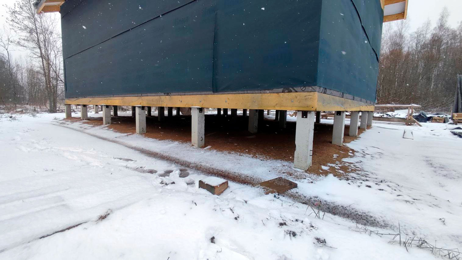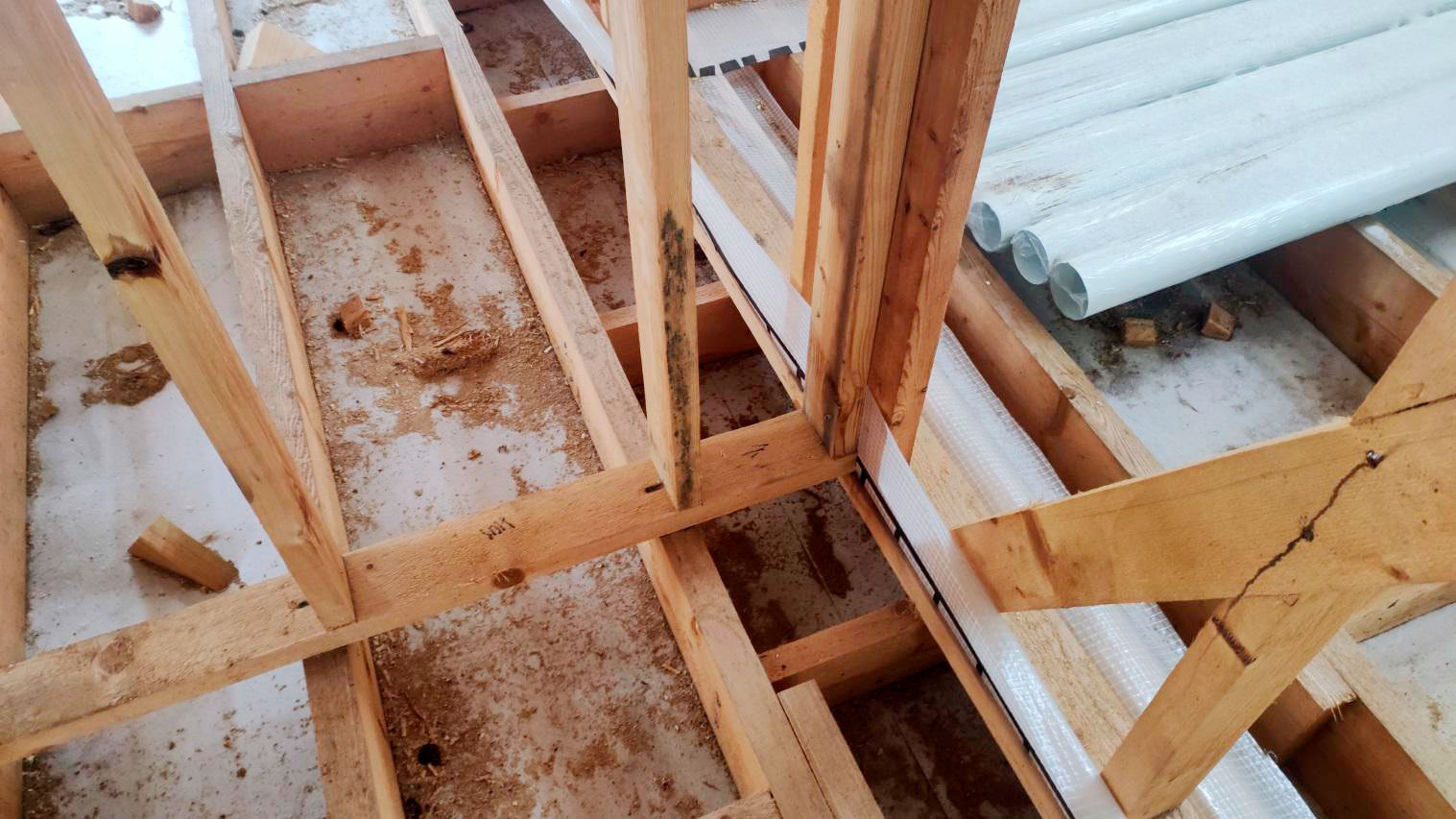 Внутри каркаса лежит снег на материалах и деревянных элементах, которые ещё не обработаны антисептированными/биозащитными составами. Это прямой признак того, что внутреннее пространство не защищено и конструкция регулярно получает влагу.