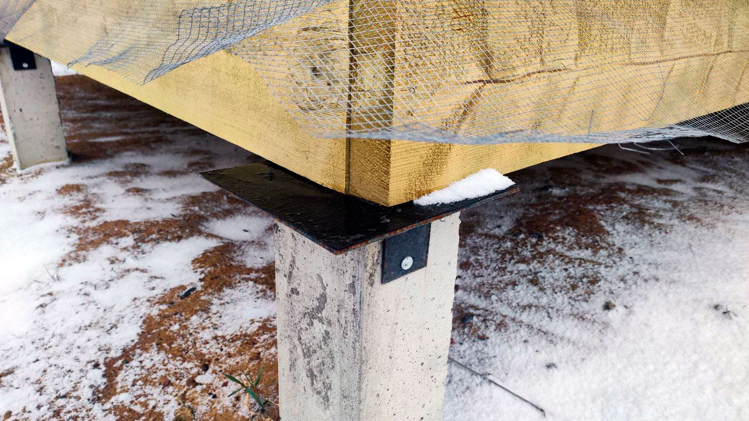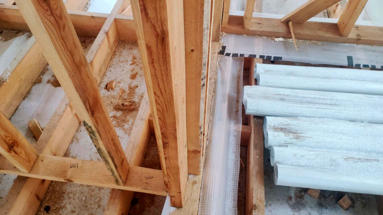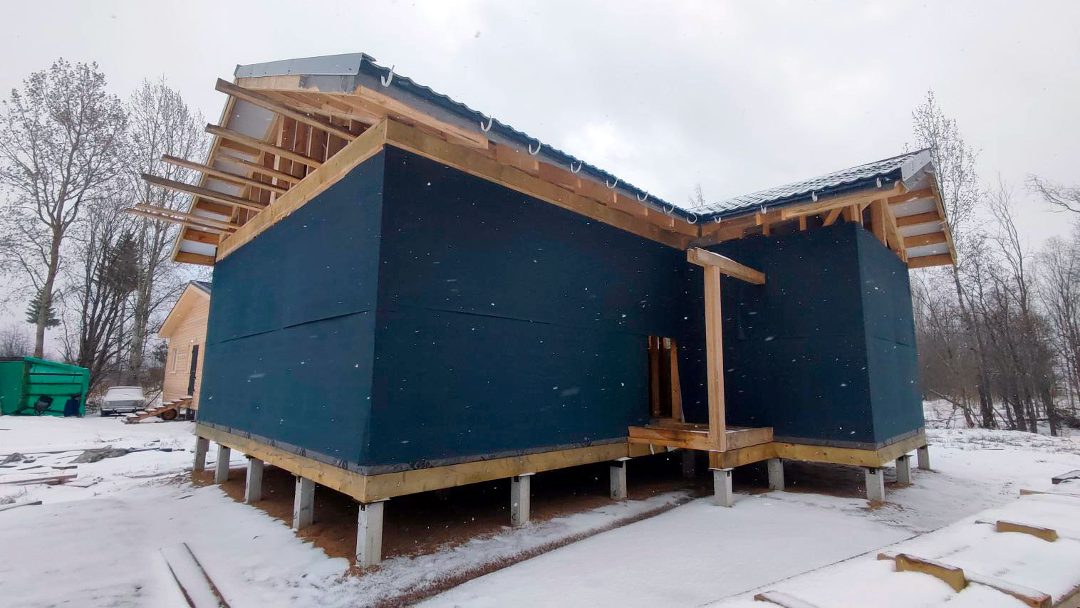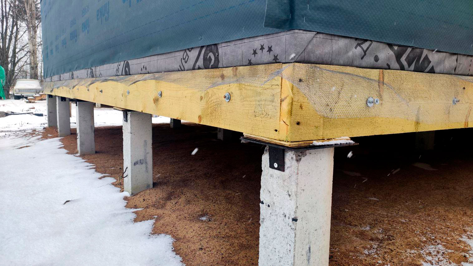 Внутри каркаса лежит снег на материалах и деревянных элементах, которые ещё не обработаны антисептированными/биозащитными составами. Это прямой признак того, что внутреннее пространство не защищено и конструкция регулярно получает влагу.