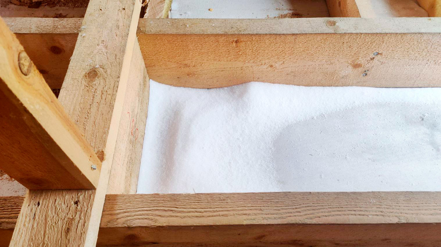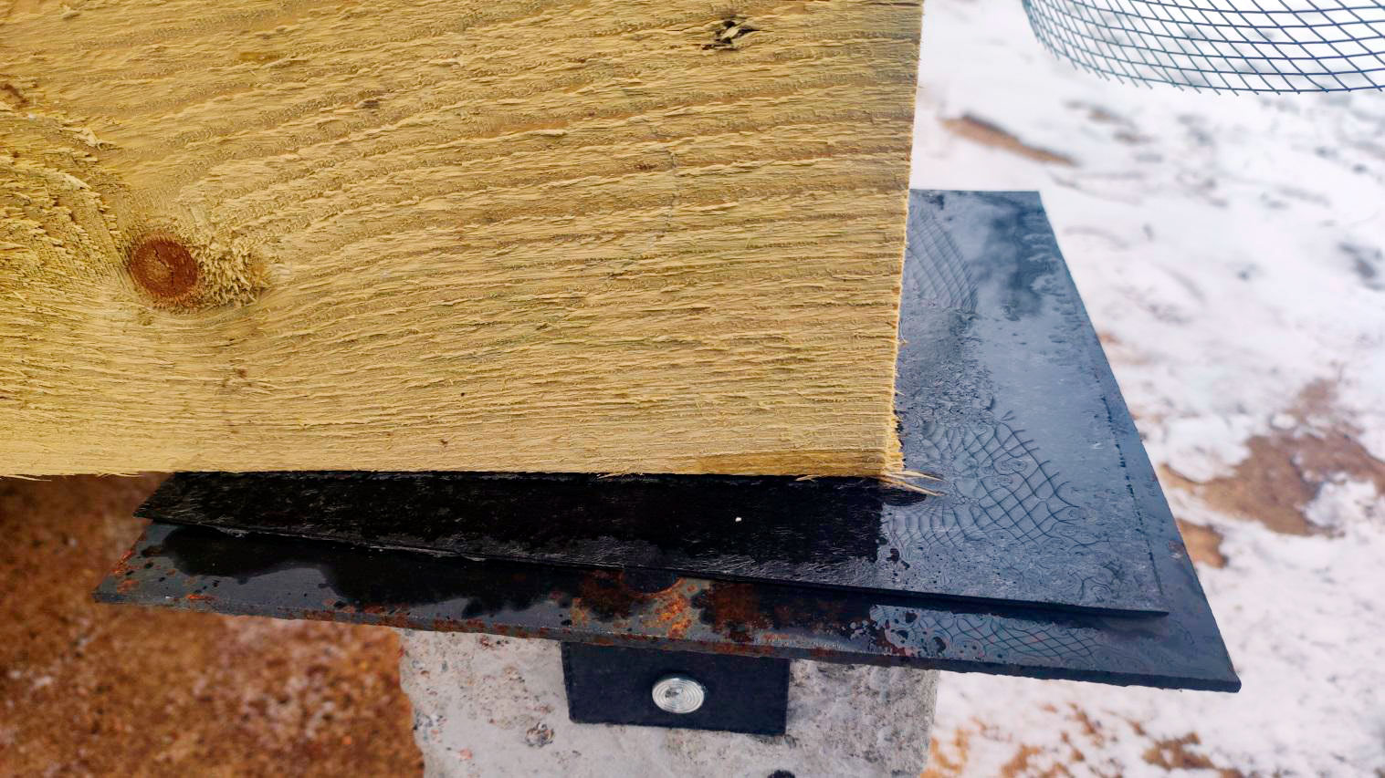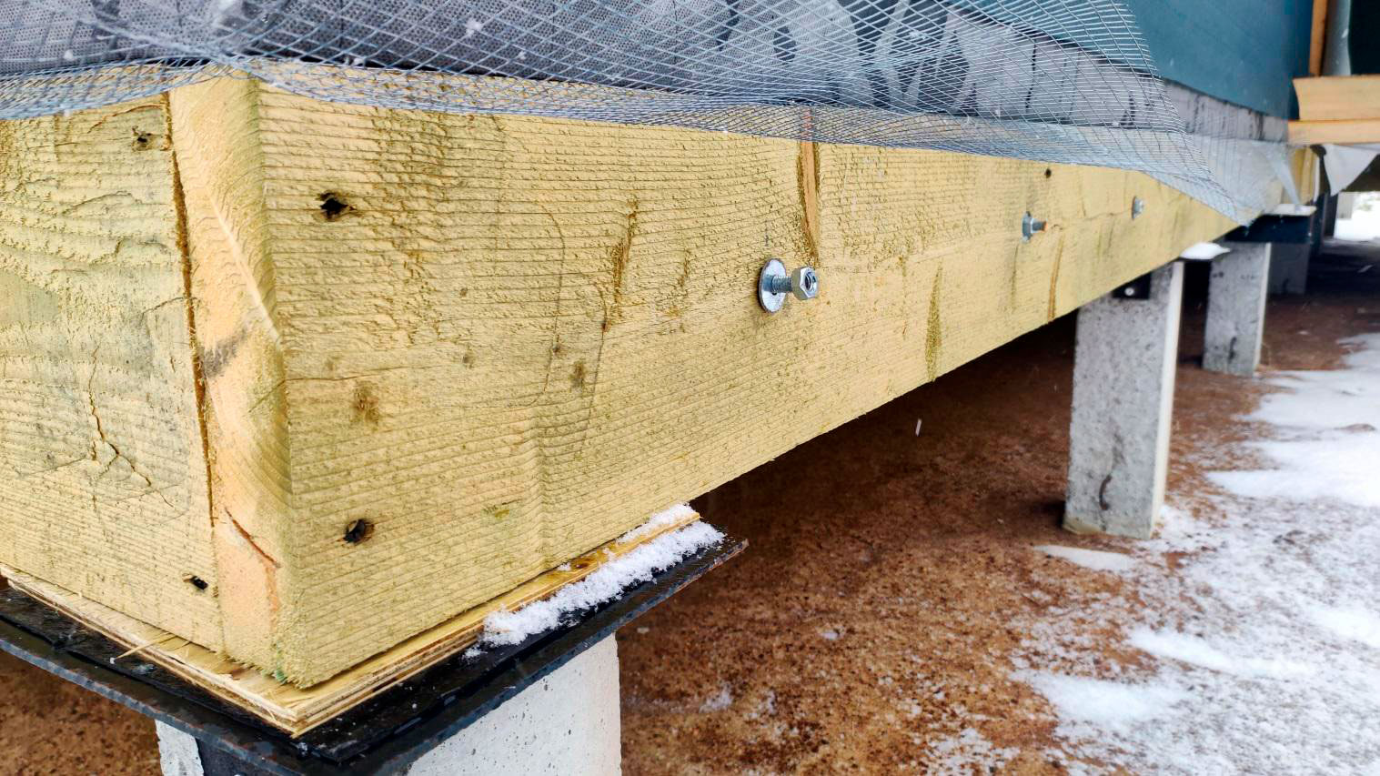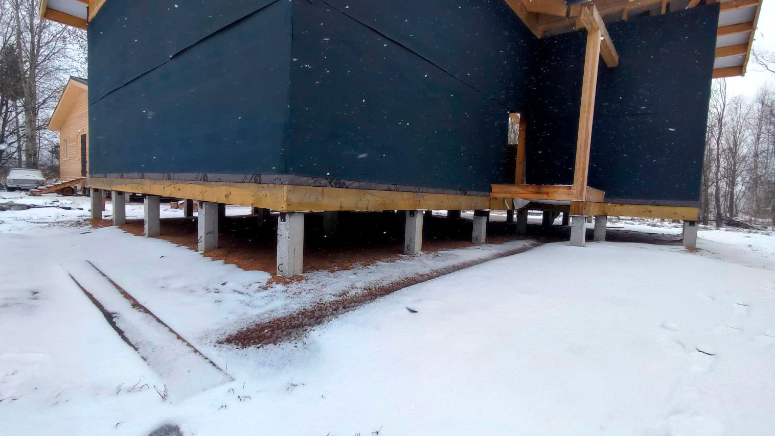 Внутри каркаса лежит снег на материалах и деревянных элементах, которые ещё не обработаны антисептированными/биозащитными составами. Это прямой признак того, что внутреннее пространство не защищено и конструкция регулярно получает влагу.