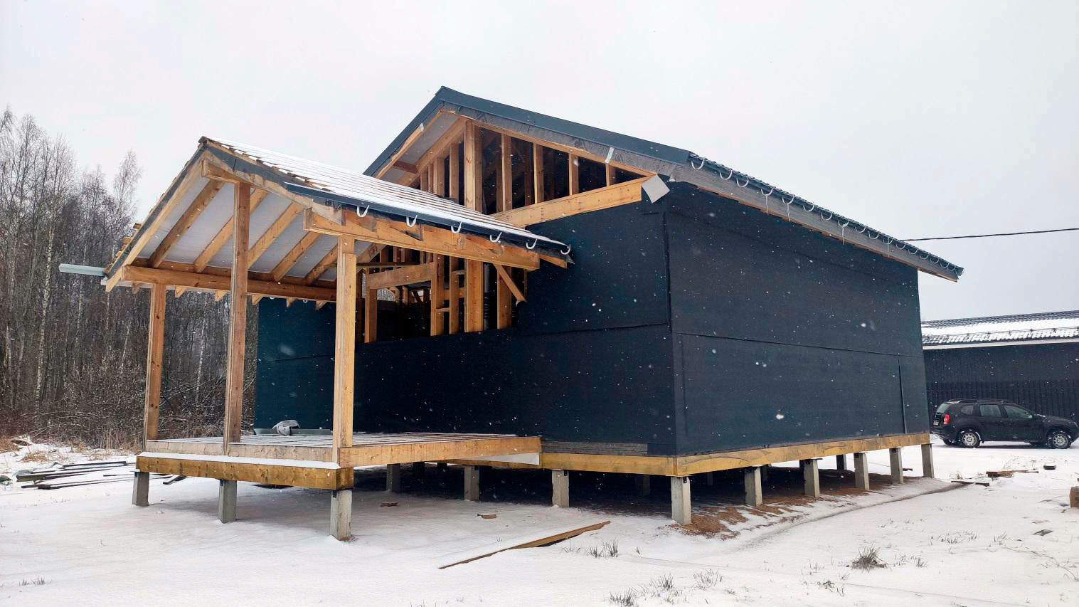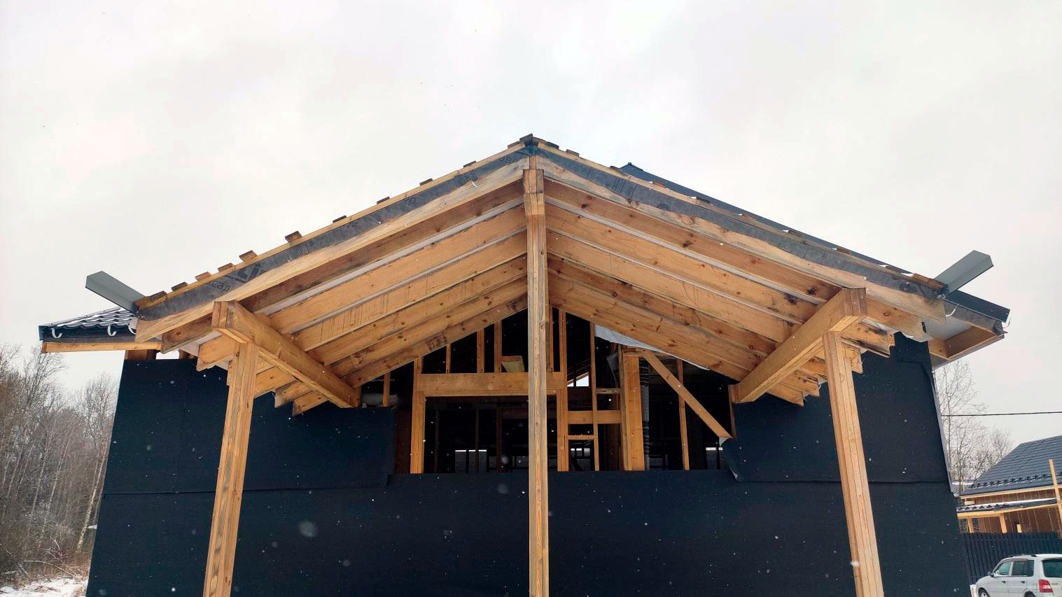 То есть дом не доведён до стадии, когда он защищён от погоды, а без закрытого контура любые паузы в работах становятся особенно рискованными для деревянных конструкций.