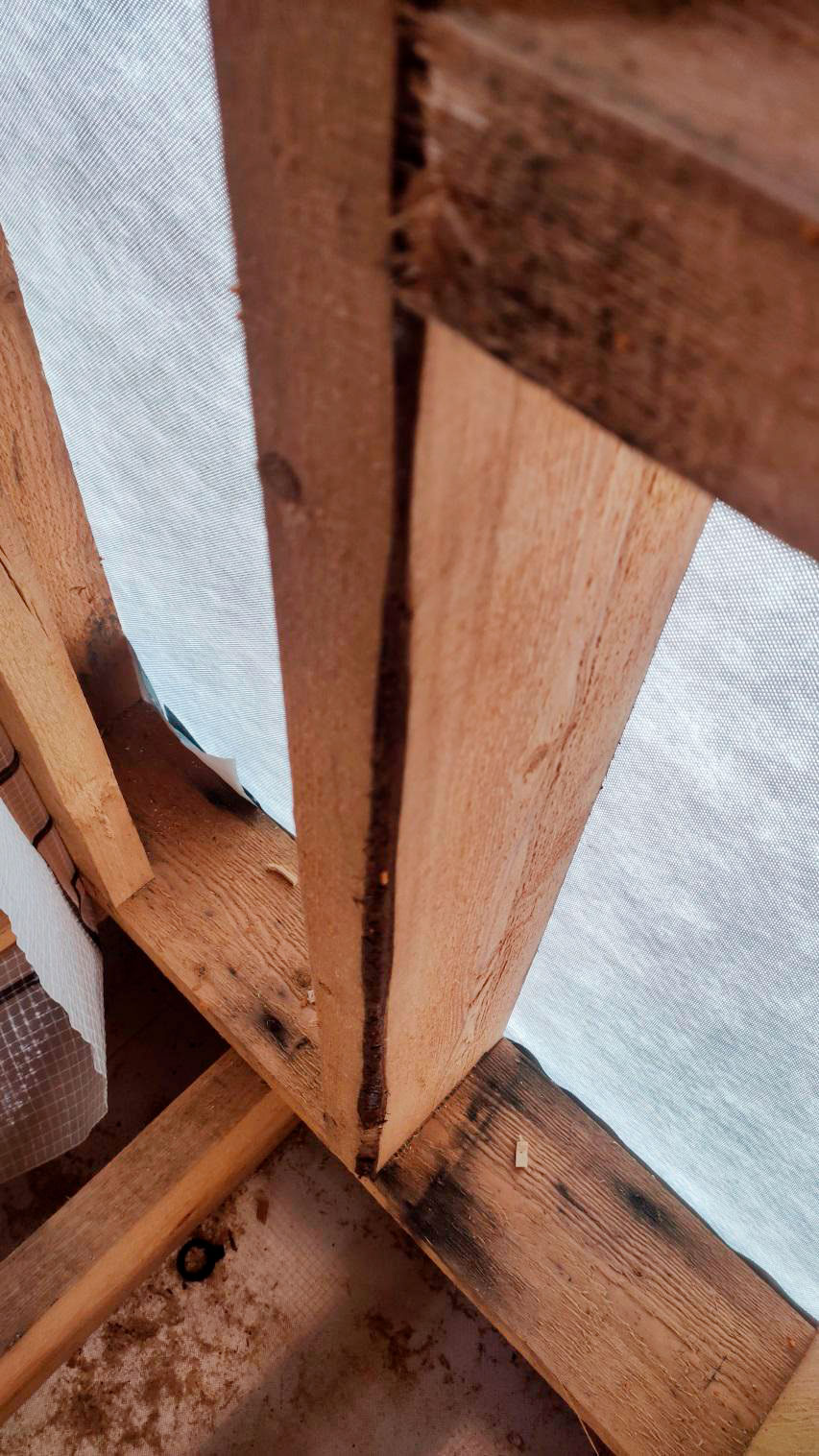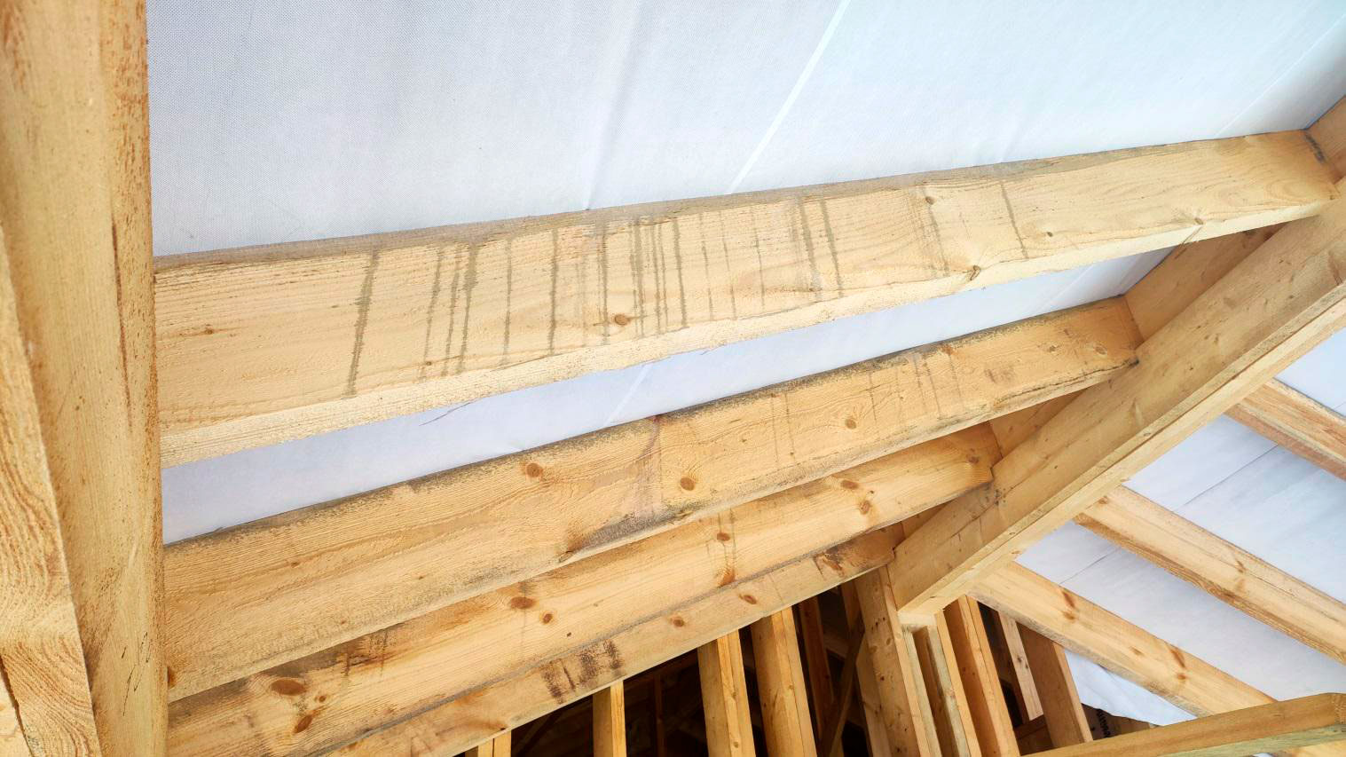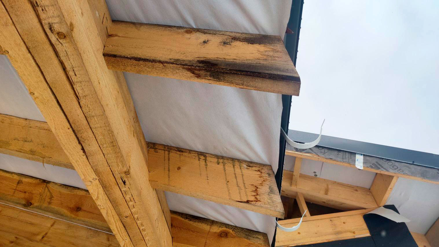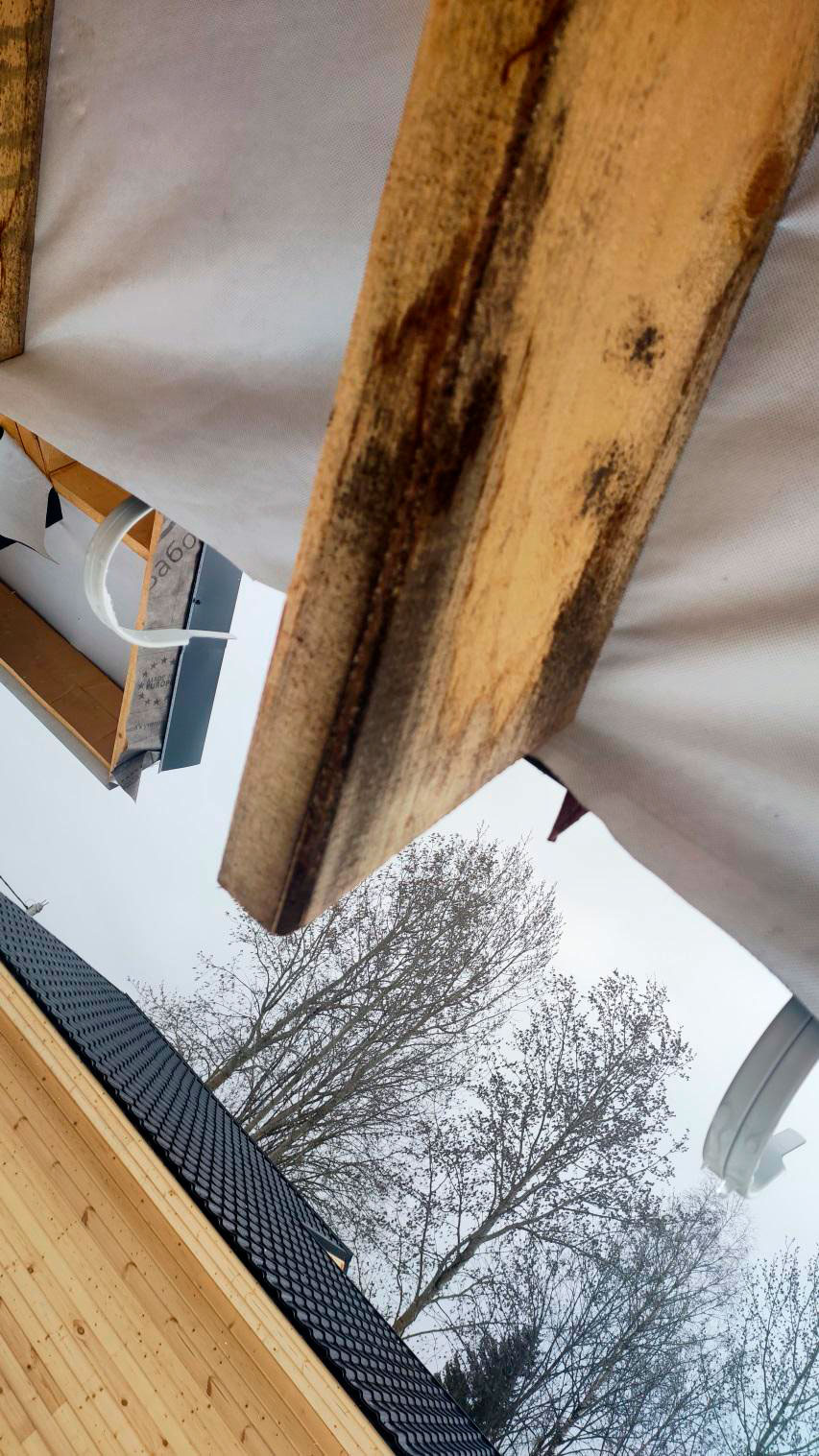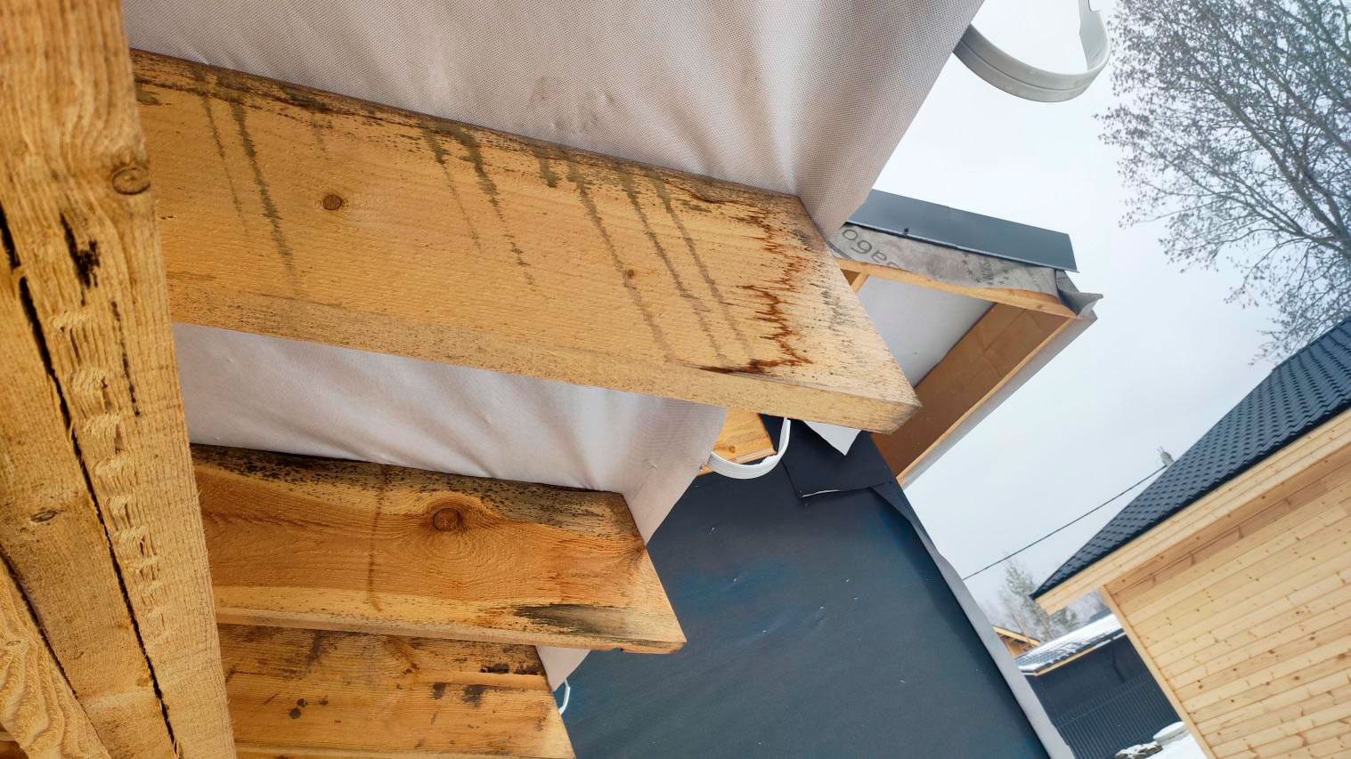 Причина намокания в том числе связана с тем, что кровля на момент осмотра не была завершена в полном объёме. В результате влага попадает на деревянные элементы: снаружи следы намокания, а внутри, как уже сказал, проявляется вплоть до снега на конструкциях.