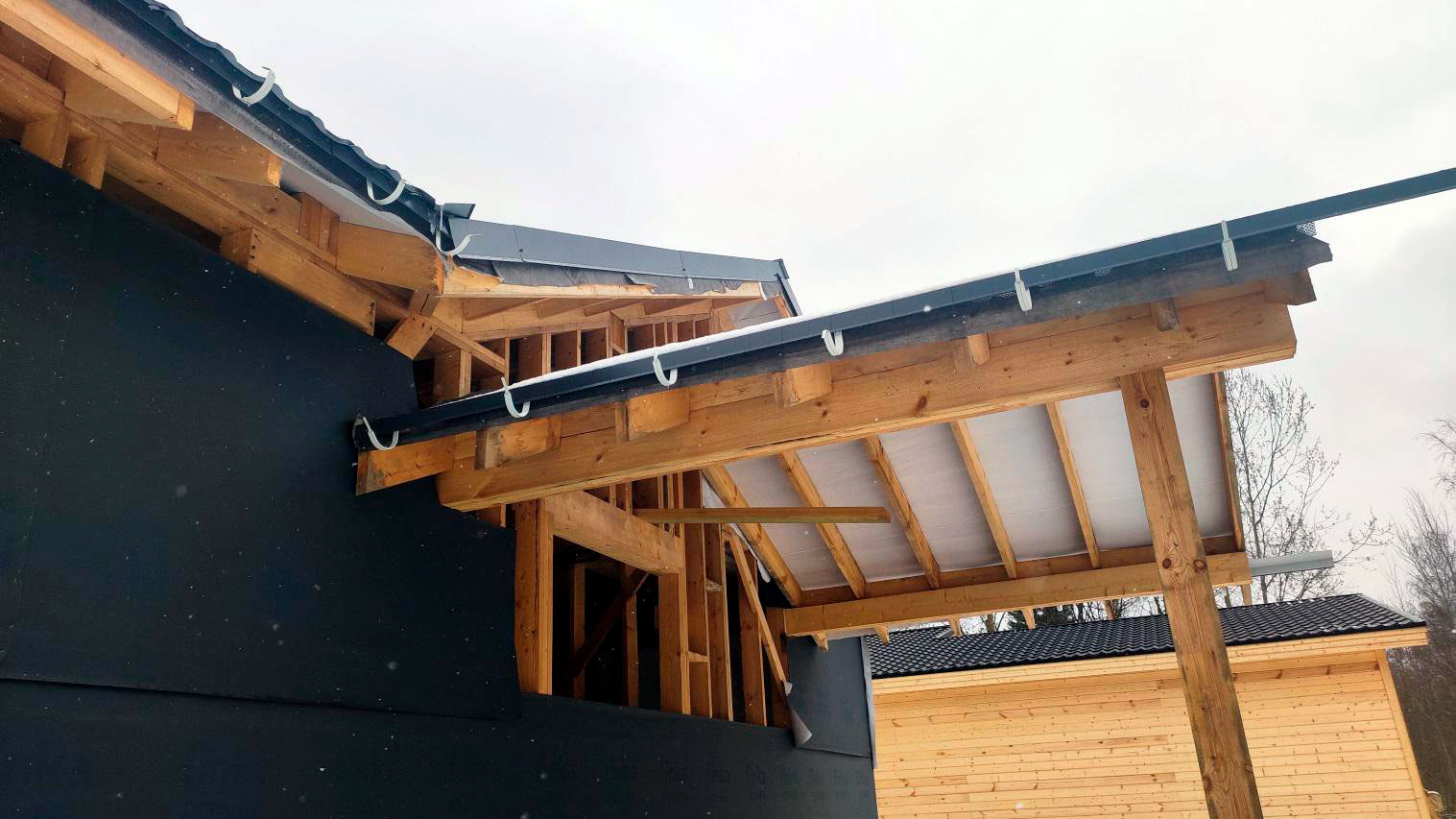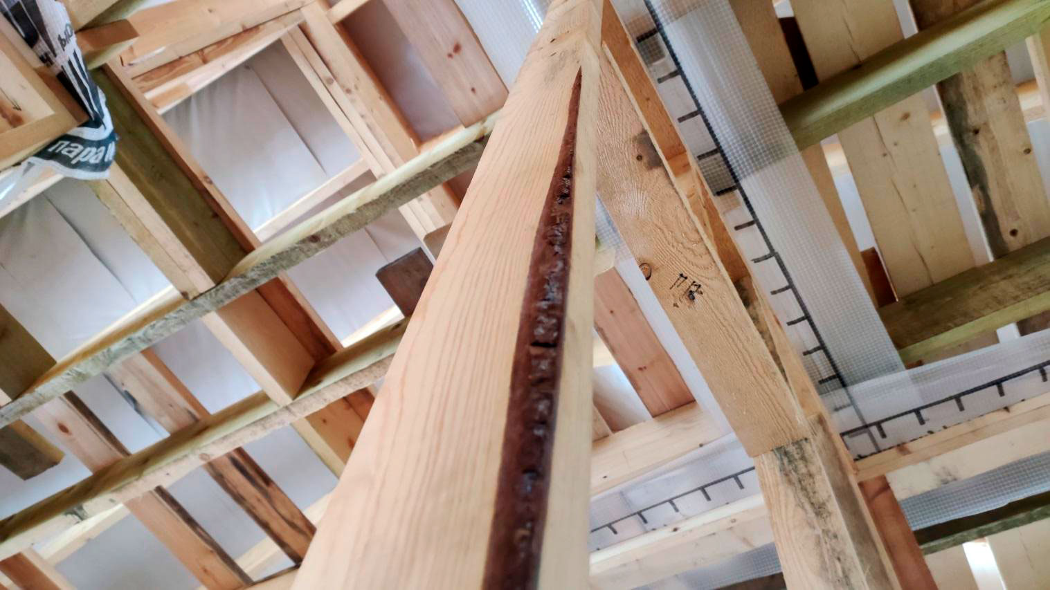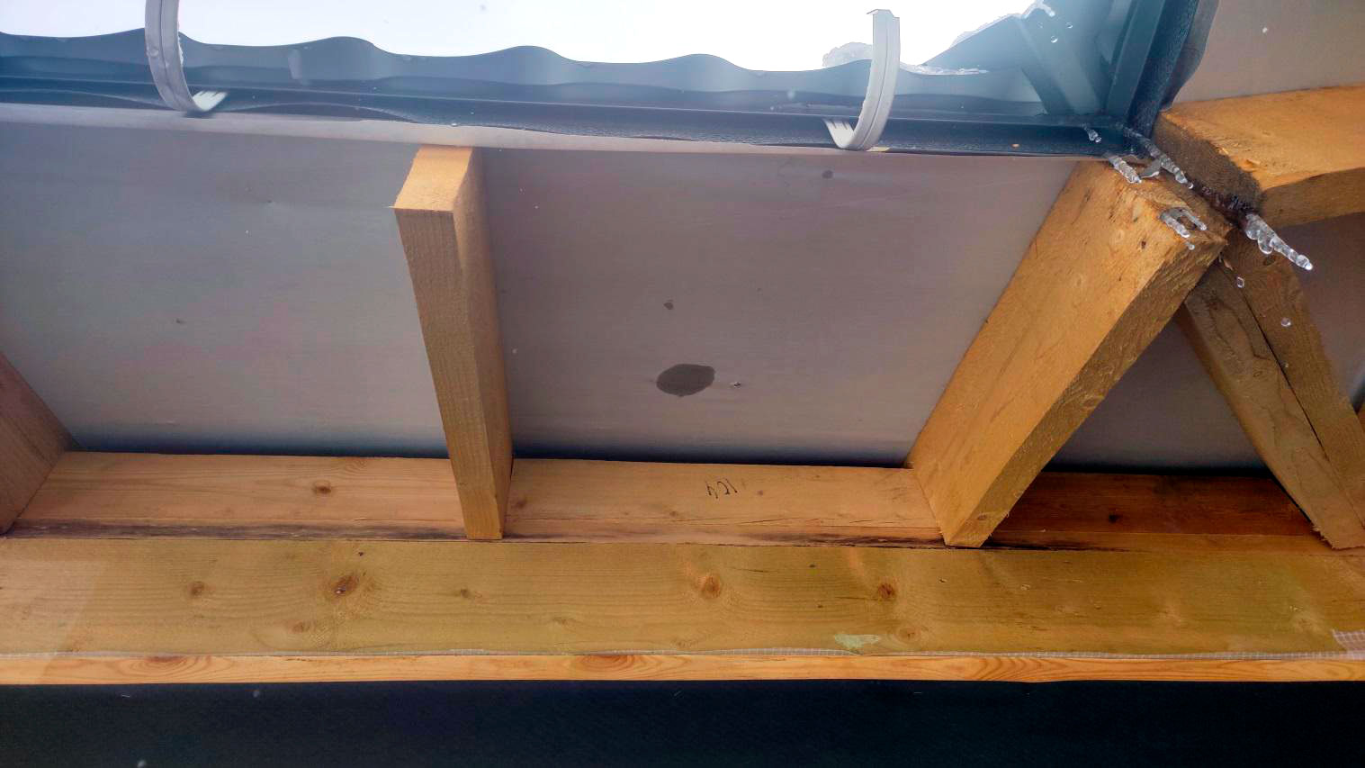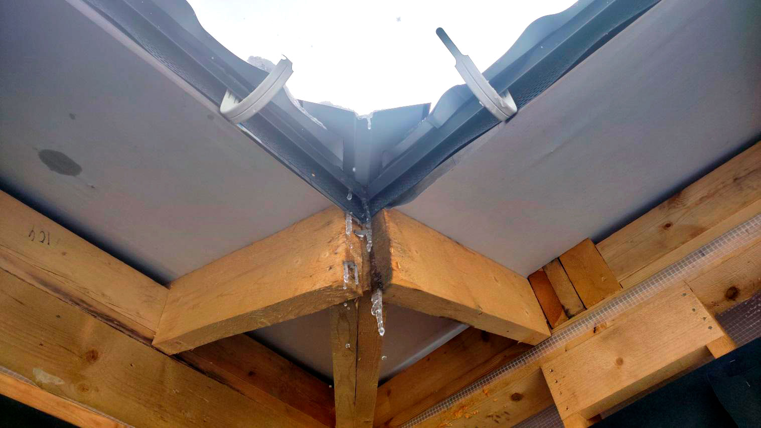 Причина намокания в том числе связана с тем, что кровля на момент осмотра не была завершена в полном объёме. В результате влага попадает на деревянные элементы: снаружи следы намокания, а внутри, как уже сказал, проявляется вплоть до снега на конструкциях.