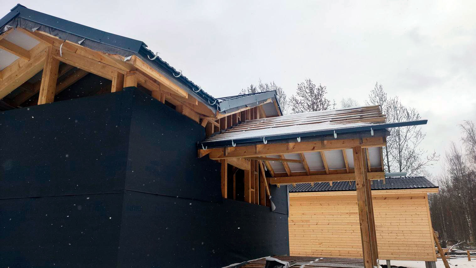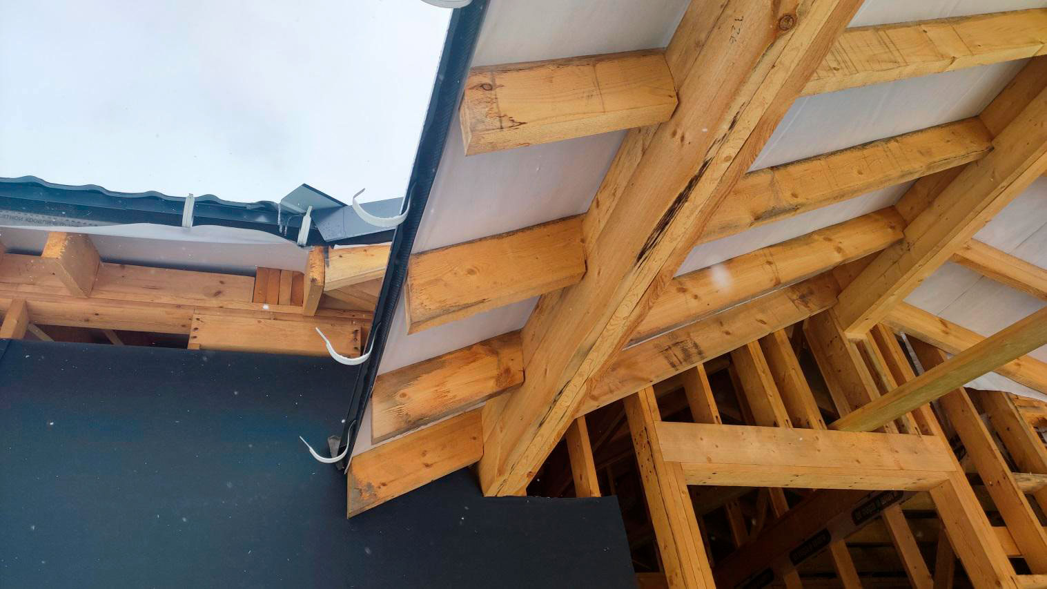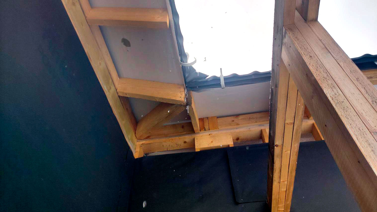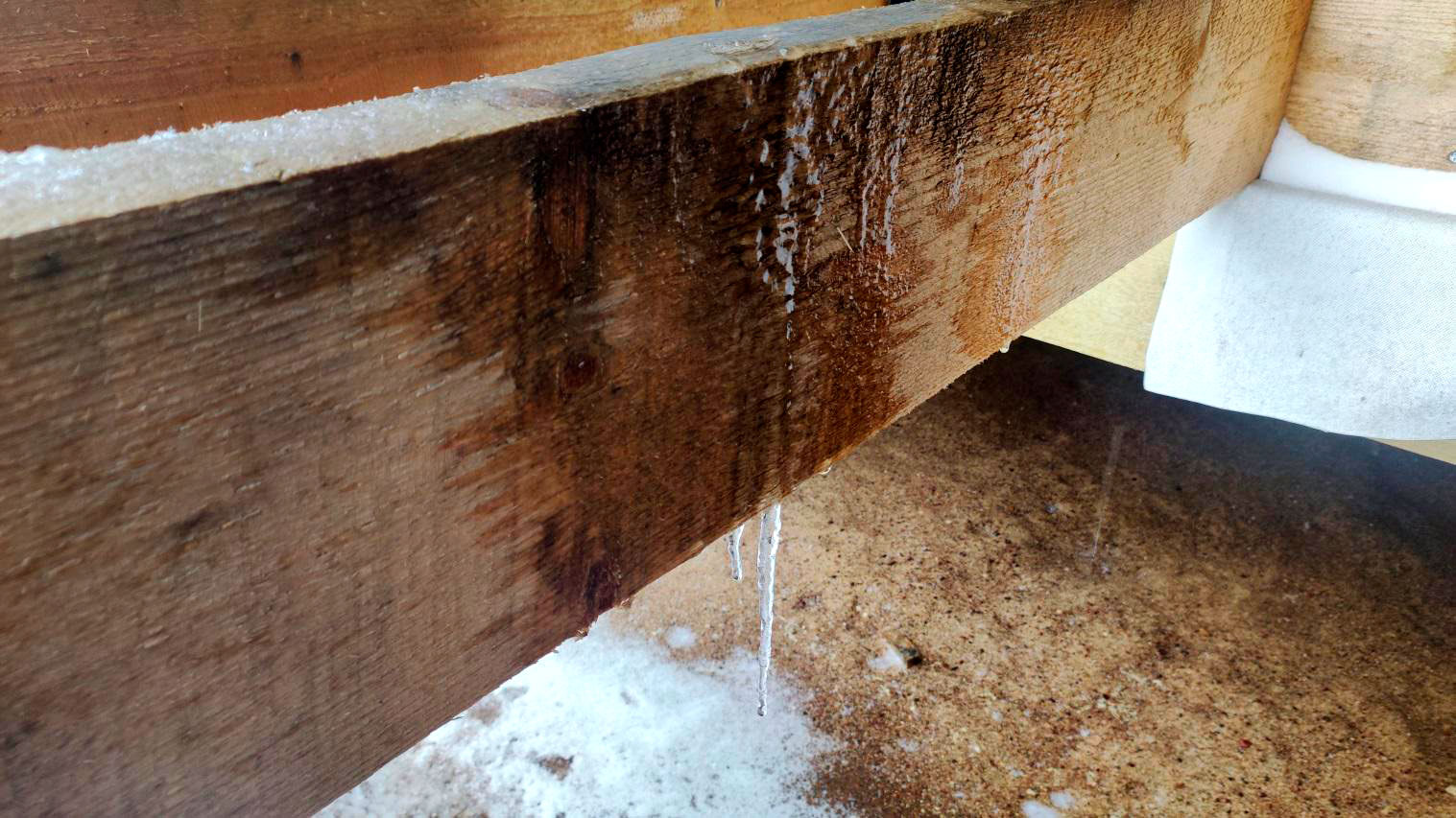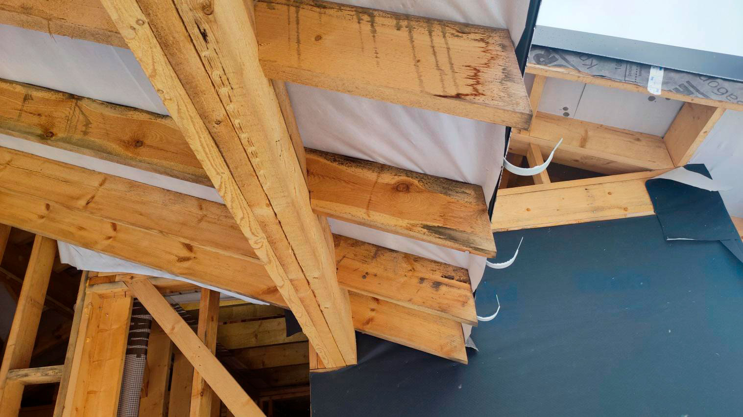 Причина намокания в том числе связана с тем, что кровля на момент осмотра не была завершена в полном объёме. В результате влага попадает на деревянные элементы: снаружи следы намокания, а внутри, как уже сказал, проявляется вплоть до снега на конструкциях.