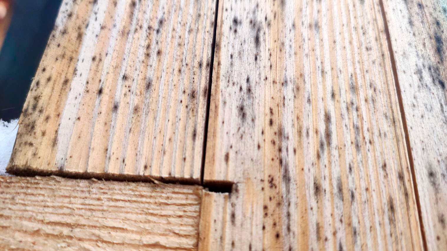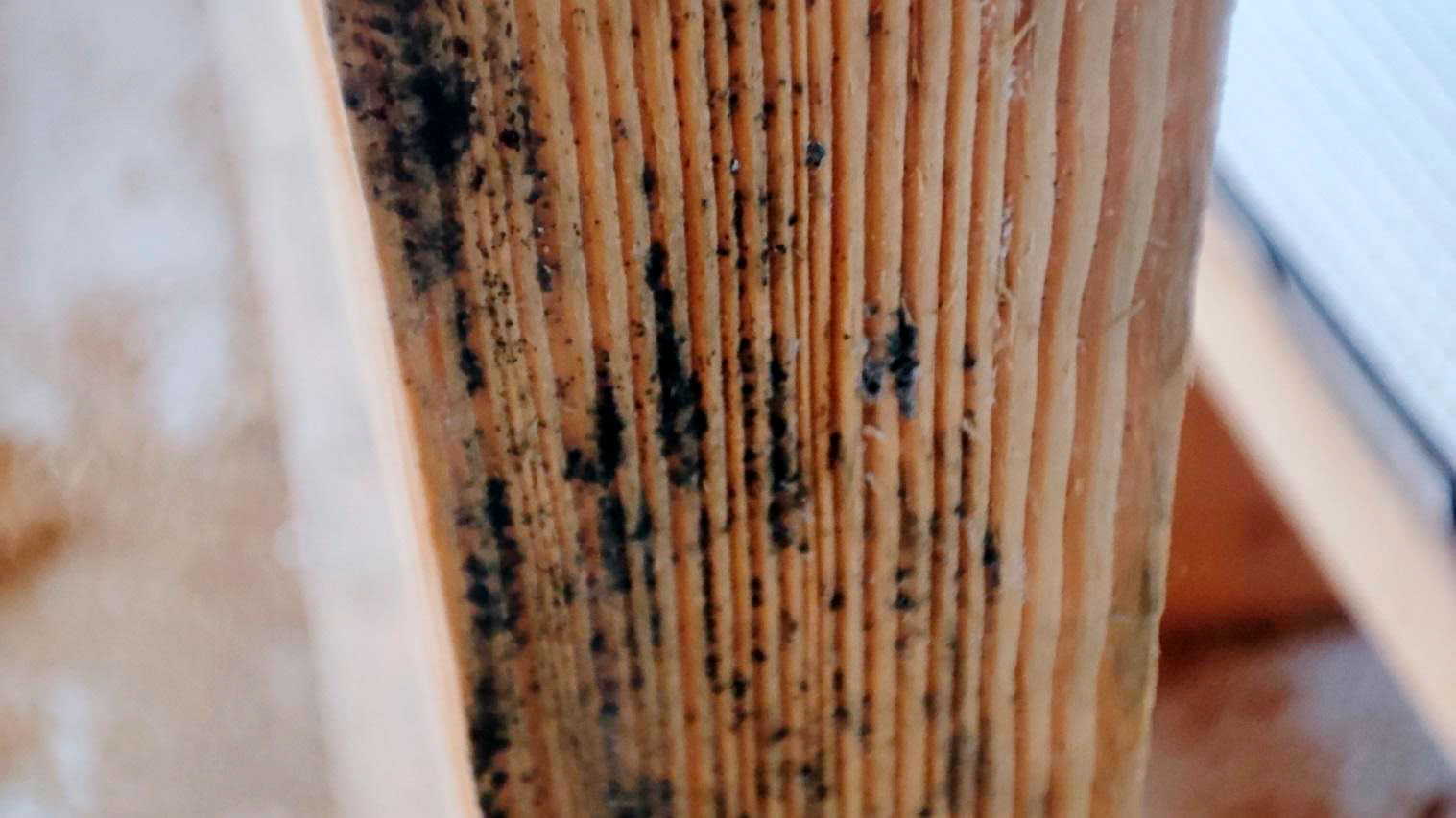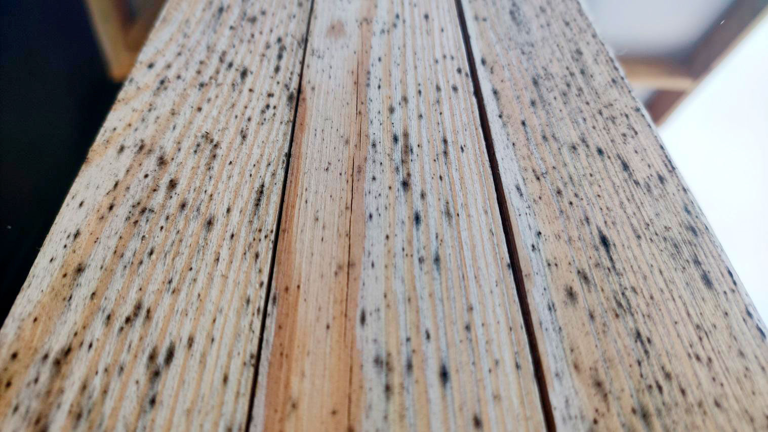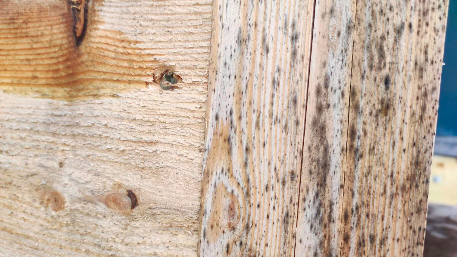 Отличить поверхностное от глубокого. Налёт и пятна это одно. Древесина, которая стала мягкой, рыхлой, крошится или имеет явные поражения, это другое.