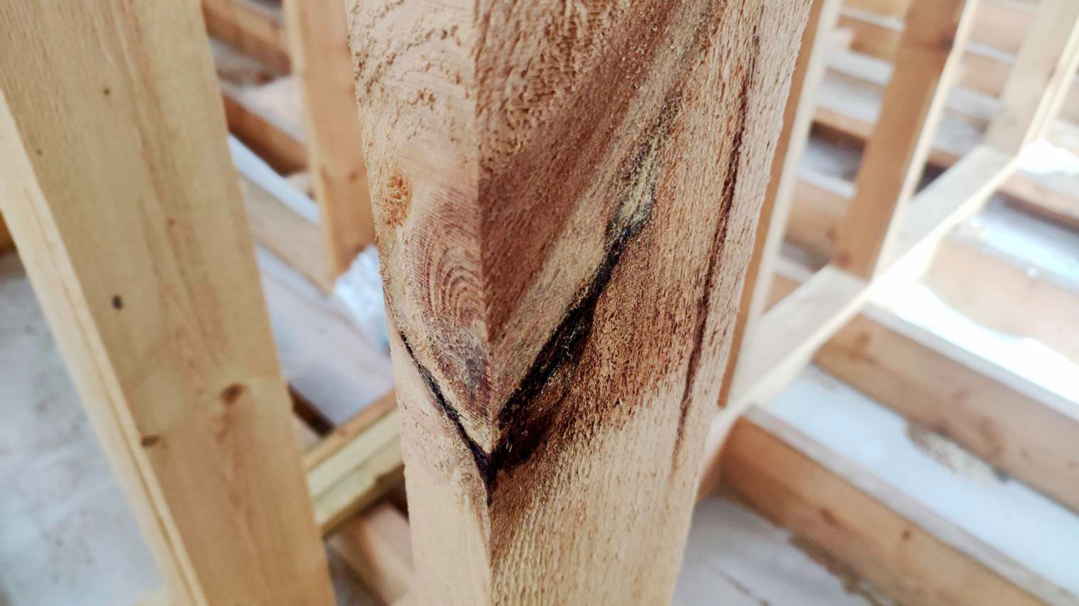 Несущие деревянные конструкции должны выполняться из древесины нормального качества и в эксплуатационном состоянии. В данном случае зафиксированы признаки, которые прямо говорят об обратном: древесина работала (и продолжает работать) в неблагоприятном режиме по влаге, а также имеет видимые пороки. Напомню, речь идёт о несущих элементах каркаса и кровли.