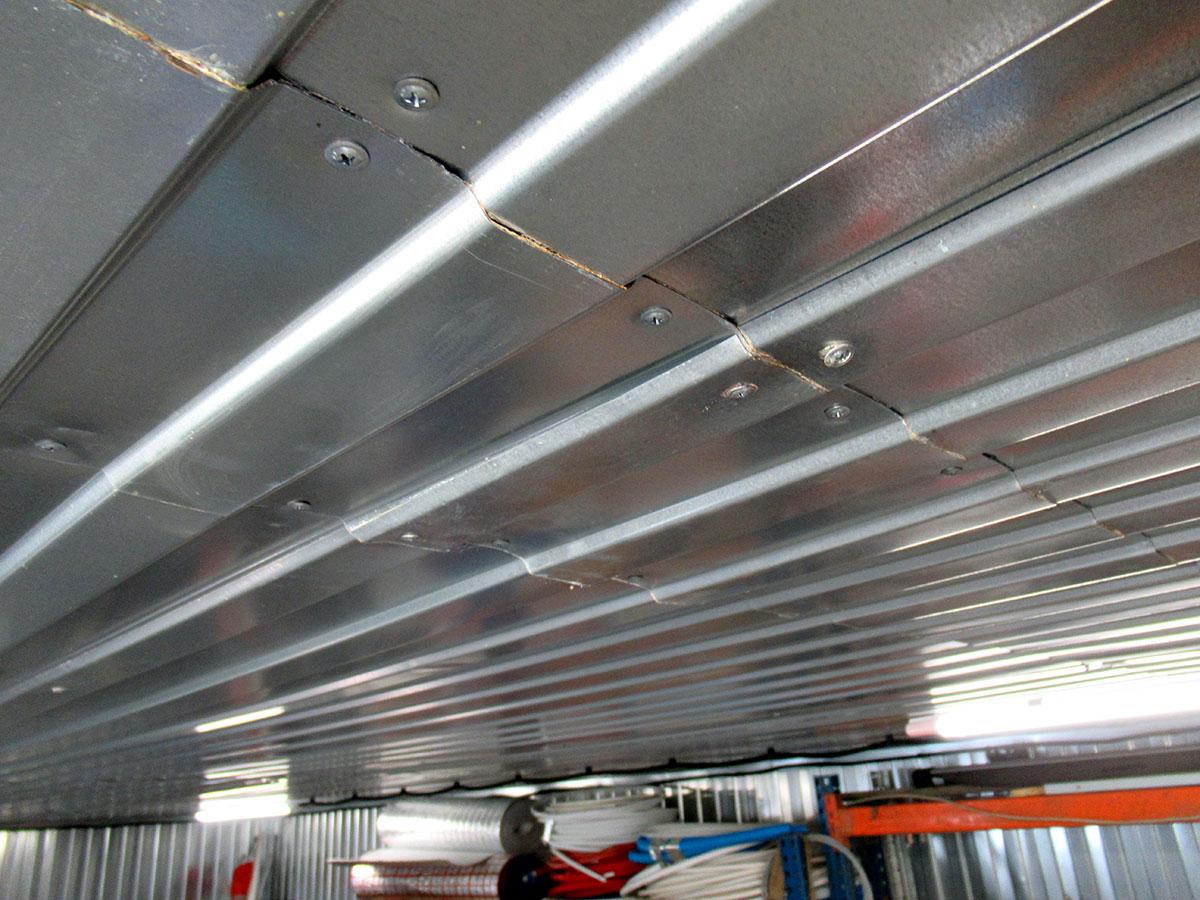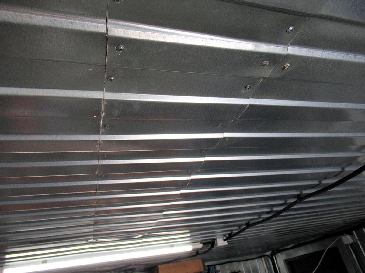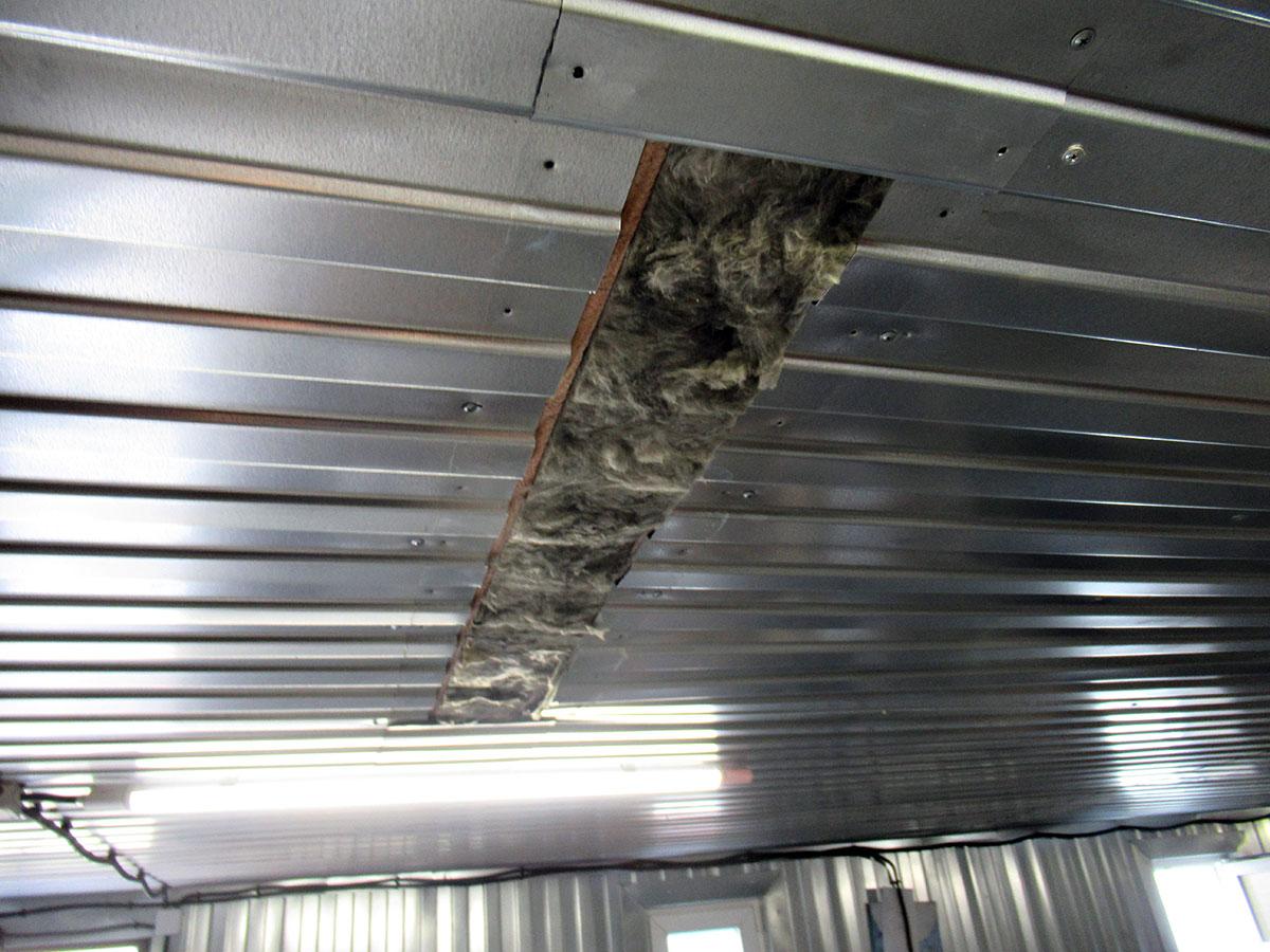 При осмотре на потолке из оцинкованного профлиста были выявлены подтеки и следы намокания. Они просматривались на разных участках внутренней отделки и подтверждали, что вода действительно попадала внутрь модульного здания.