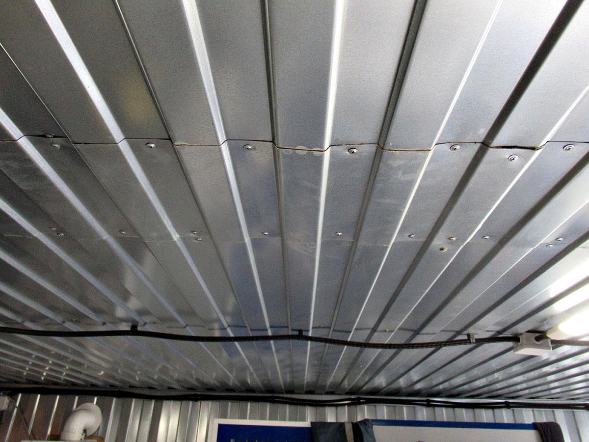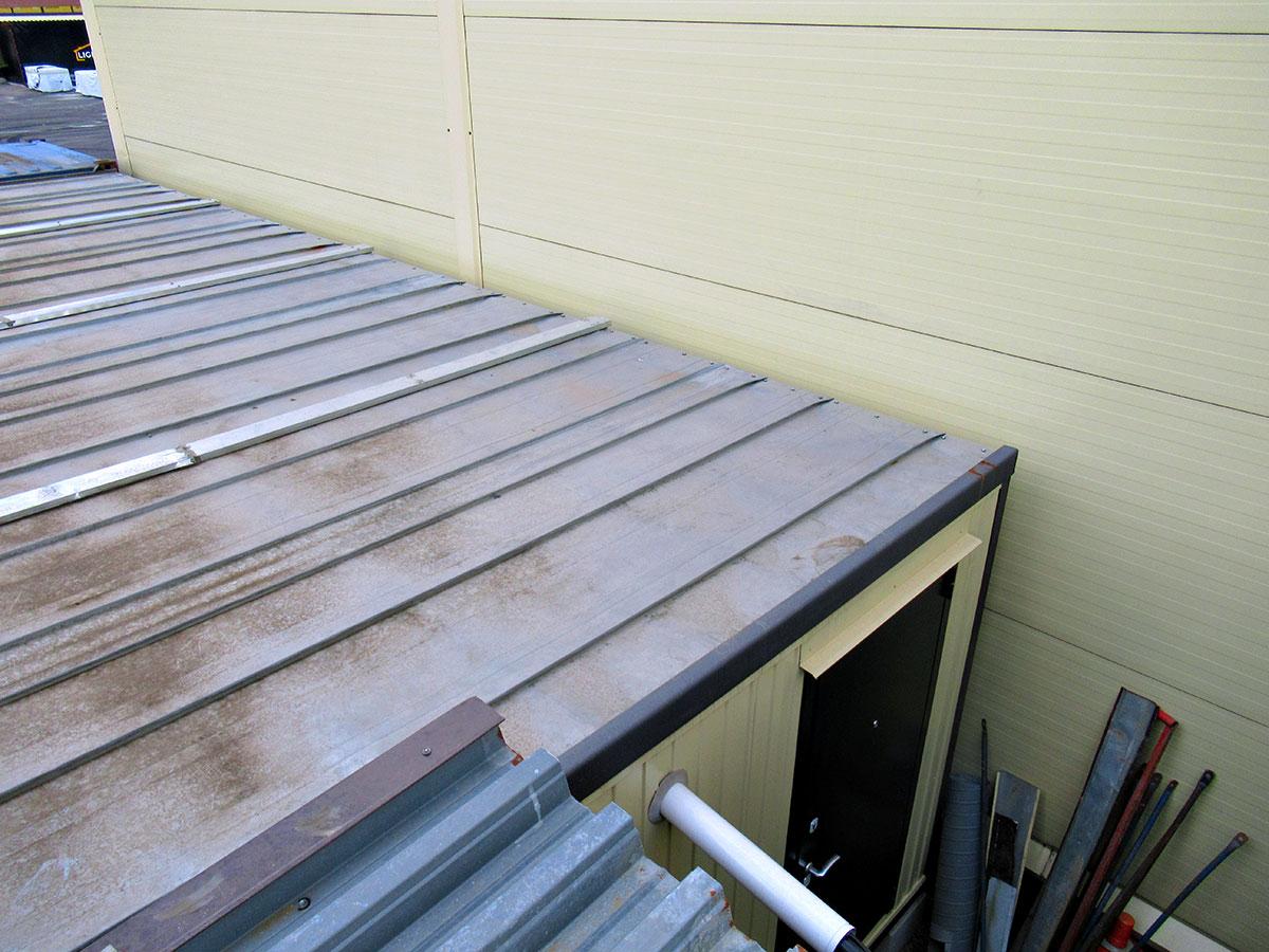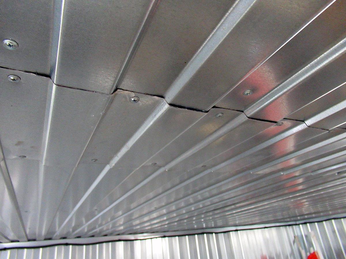 При осмотре на потолке из оцинкованного профлиста были выявлены подтеки и следы намокания. Они просматривались на разных участках внутренней отделки и подтверждали, что вода действительно попадала внутрь модульного здания.