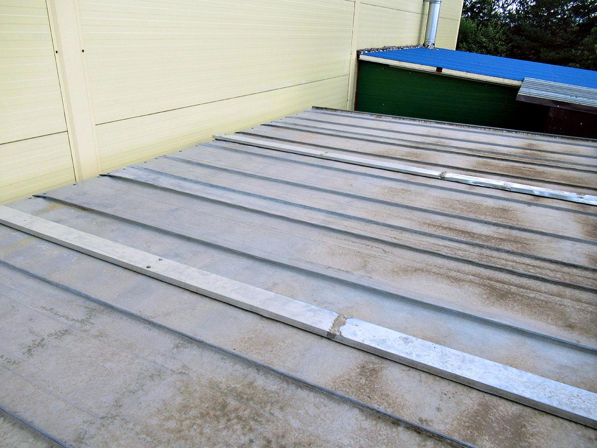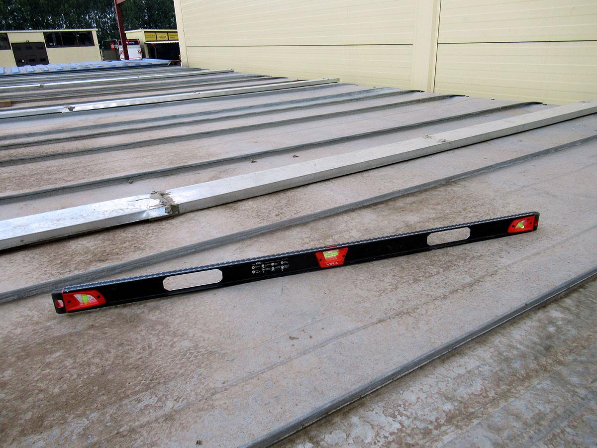 Измерение уровнем это подтвердило: фактический уклон кровли составил 0%, тогда как для кровли из оцинкованных листов он должен быть не меньше 10%. Иными словами, сама кровля изначально была выполнена так, что нормальный отвод воды с ее поверхности не обеспечивался.