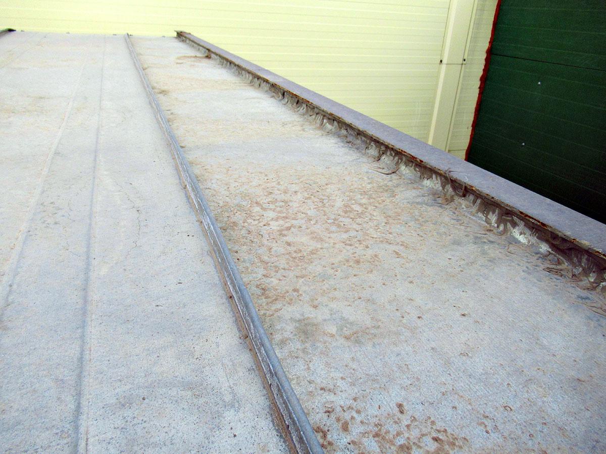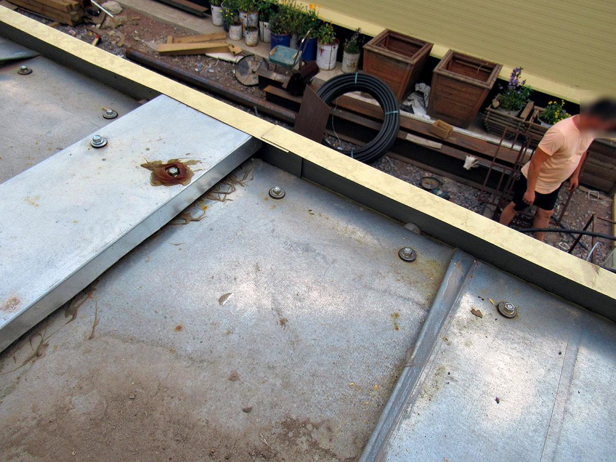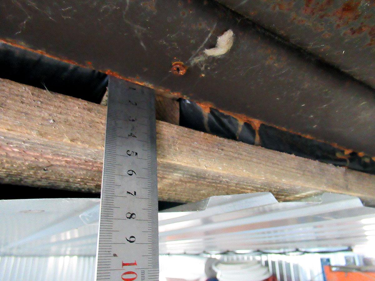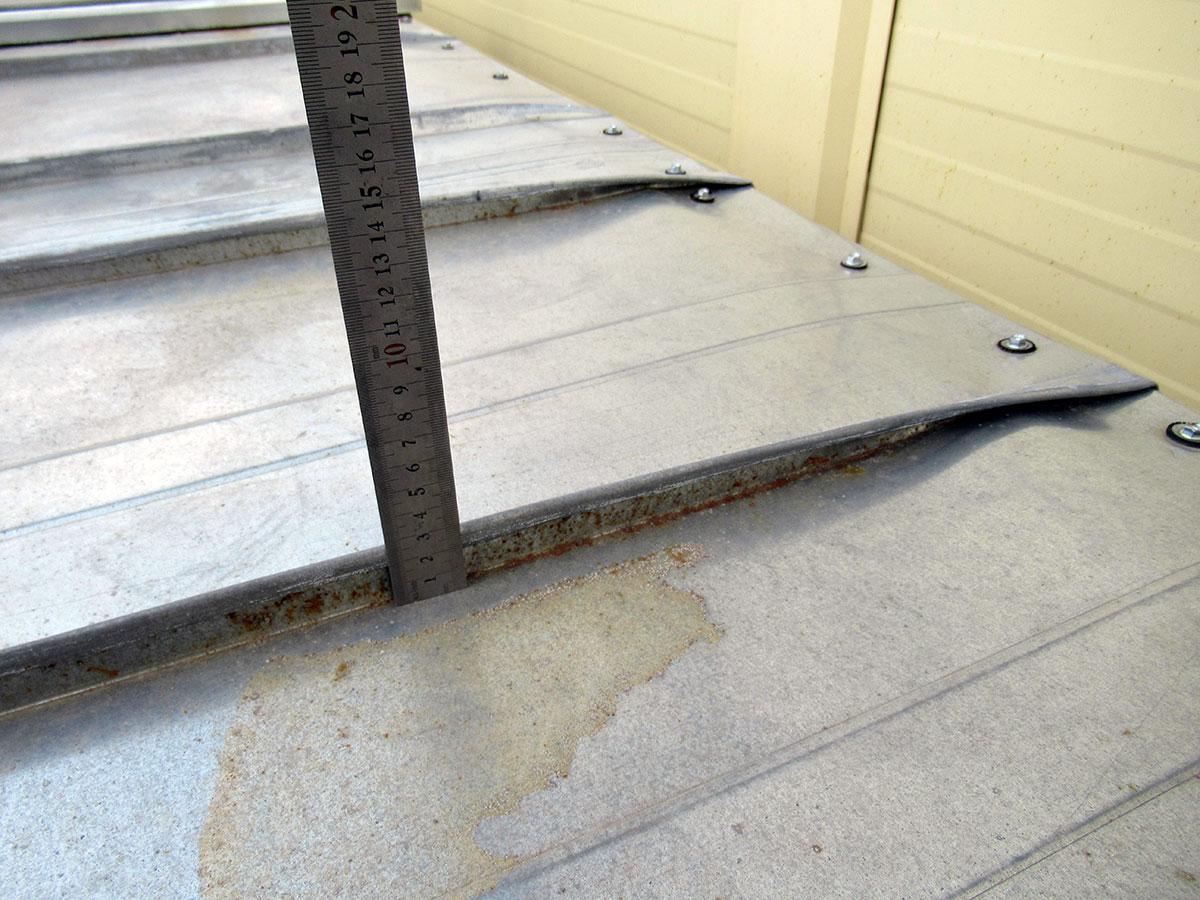 Дальнейшее обследование показало, что вода с кровли нормально не уходит. Поверхность кровельных листов фактически находилась почти в горизонте, поэтому после осадков вода не стекала, а задерживалась на крыше.