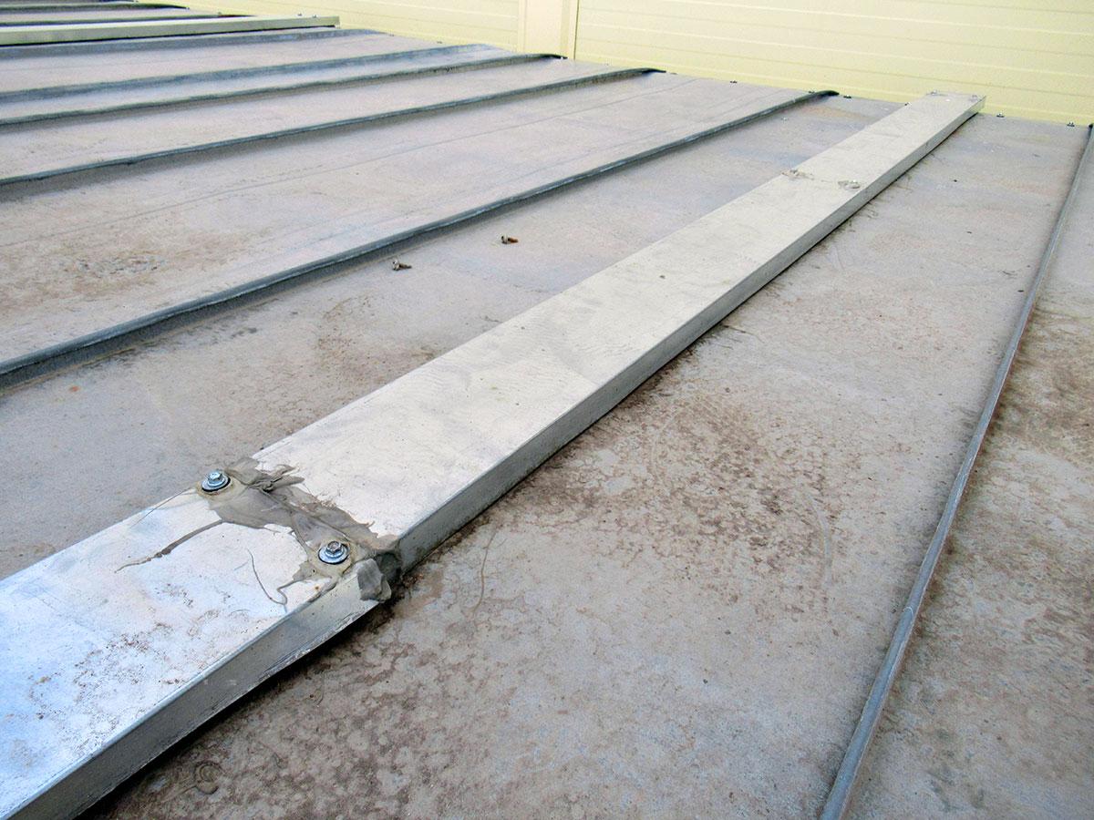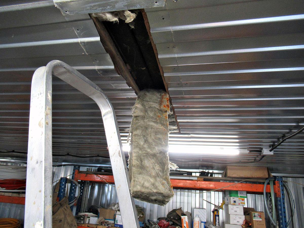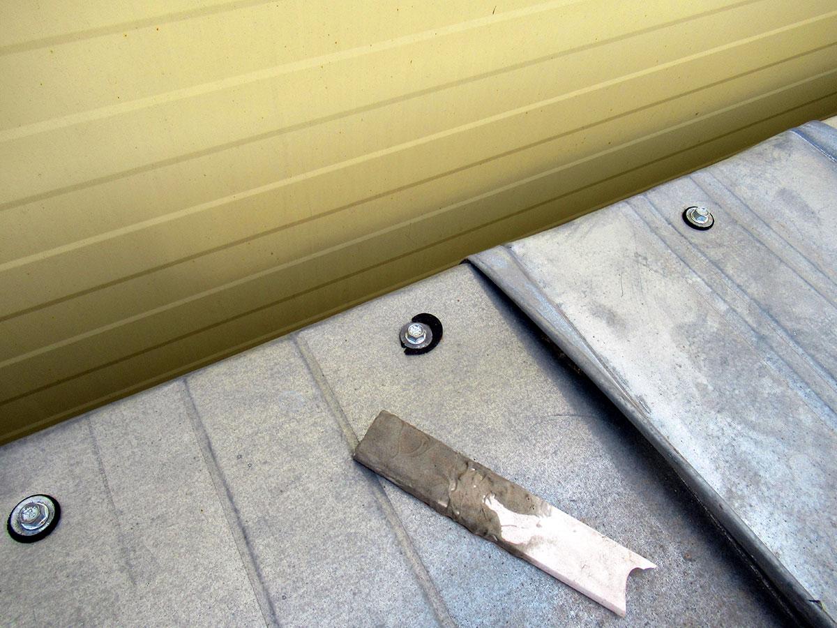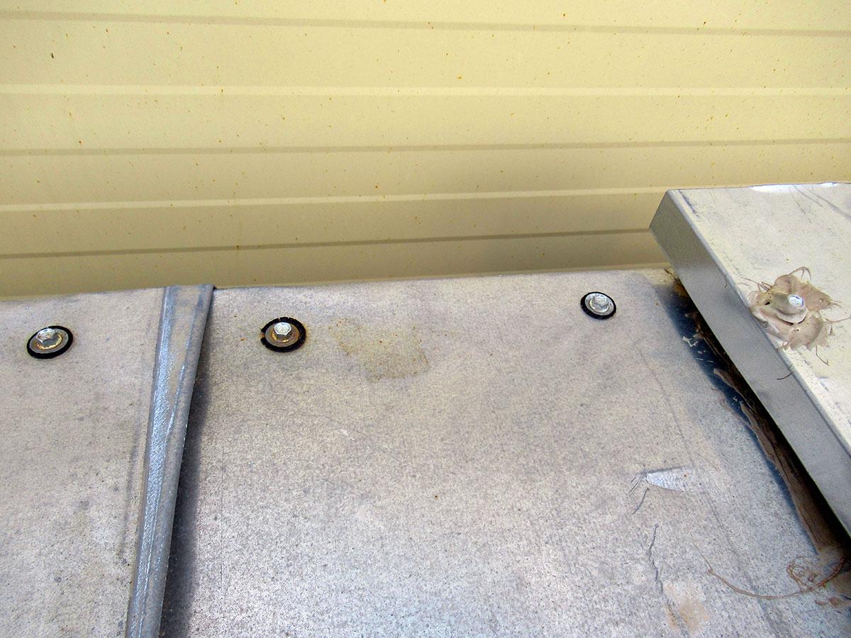 Кровельные листы были закреплены к металлическим конструкциям кровельными шурупами через плоские резиновые шайбы. Но часть этих шайб была повреждена. При застое воды на кровле такие места становятся уязвимыми: вода может проходить через точки крепления и попадать в подкровельное пространство.