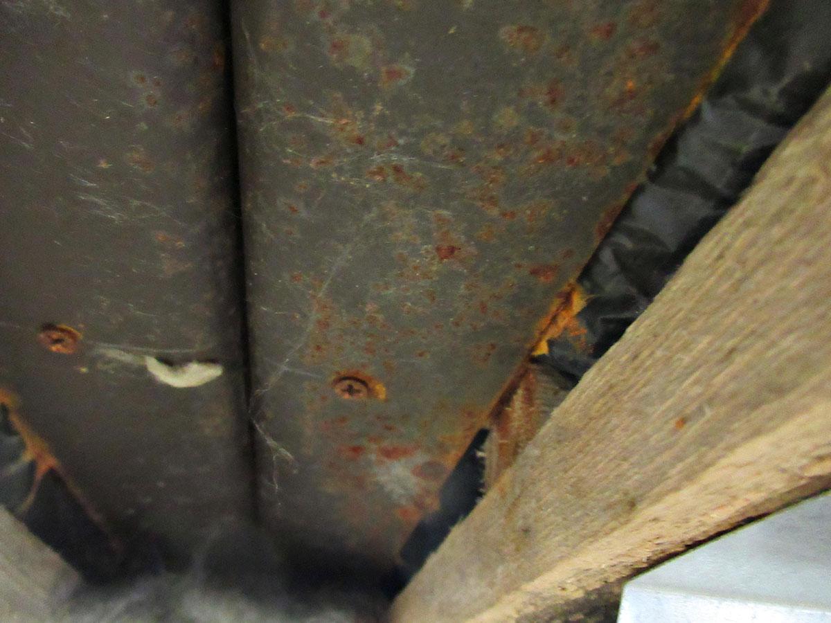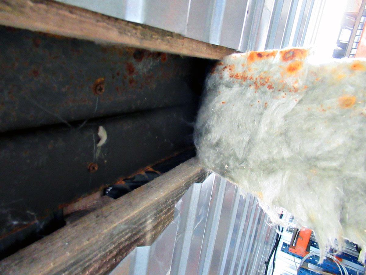 Дальше это подтверждалось уже изнутри. В подкровельном пространстве были видны подтеки с ржавчиной на утеплителе, а на металлических элементах каркаса появились следы коррозии. То есть вода не просто задерживалась на поверхности кровли, а действительно проходила внутрь конструкции.
