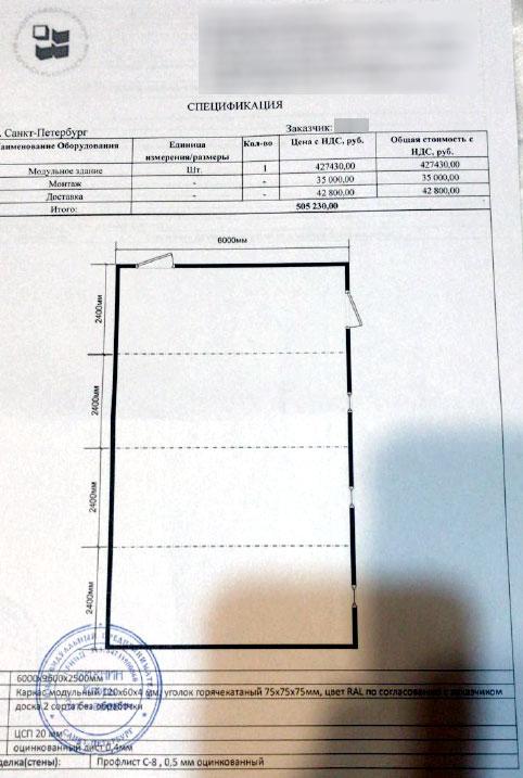 Основным документом для исследования стала спецификация к счету-договору, поскольку именно в ней были указаны план модульного здания и основные сведения о его комплектации.