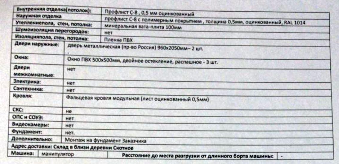 Второй лист спецификации к счету-договору со сведениями о комплектации модульного здания.